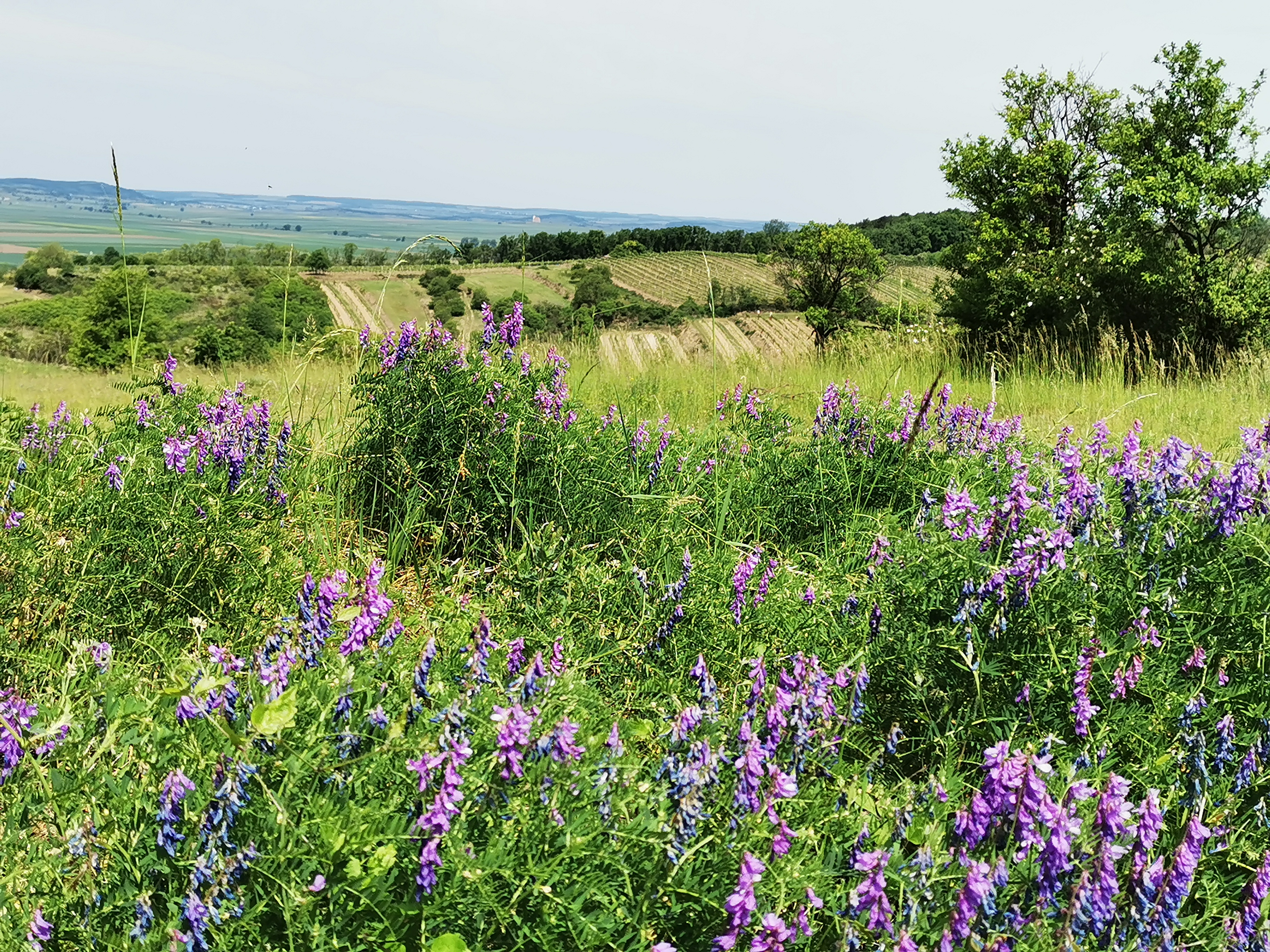 Blühende Wiese mit lila Blumen im Vordergrund, Weinberge und Felder im Hintergrund.
