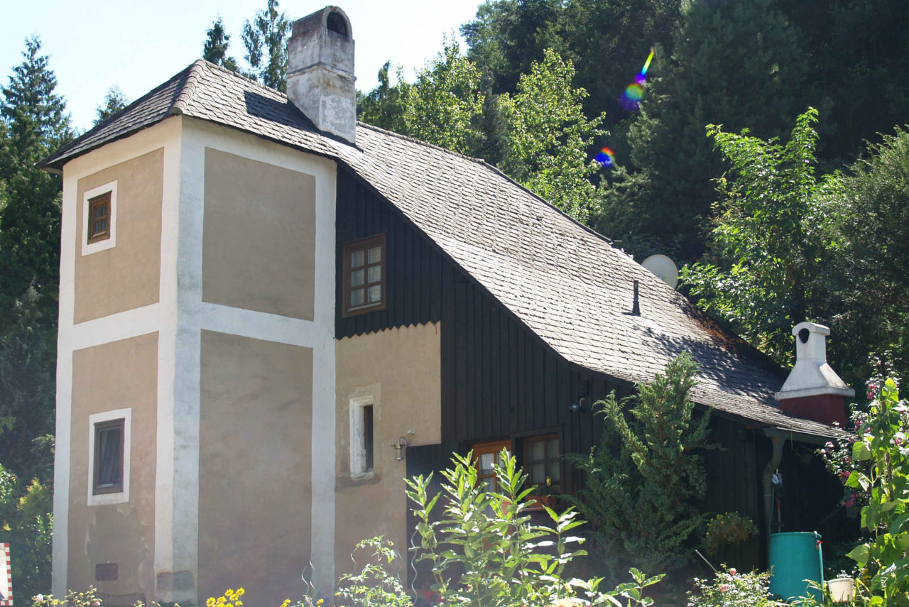 Ein kleiner Turm mit Holzzaun und Bäumen im Hintergrund.