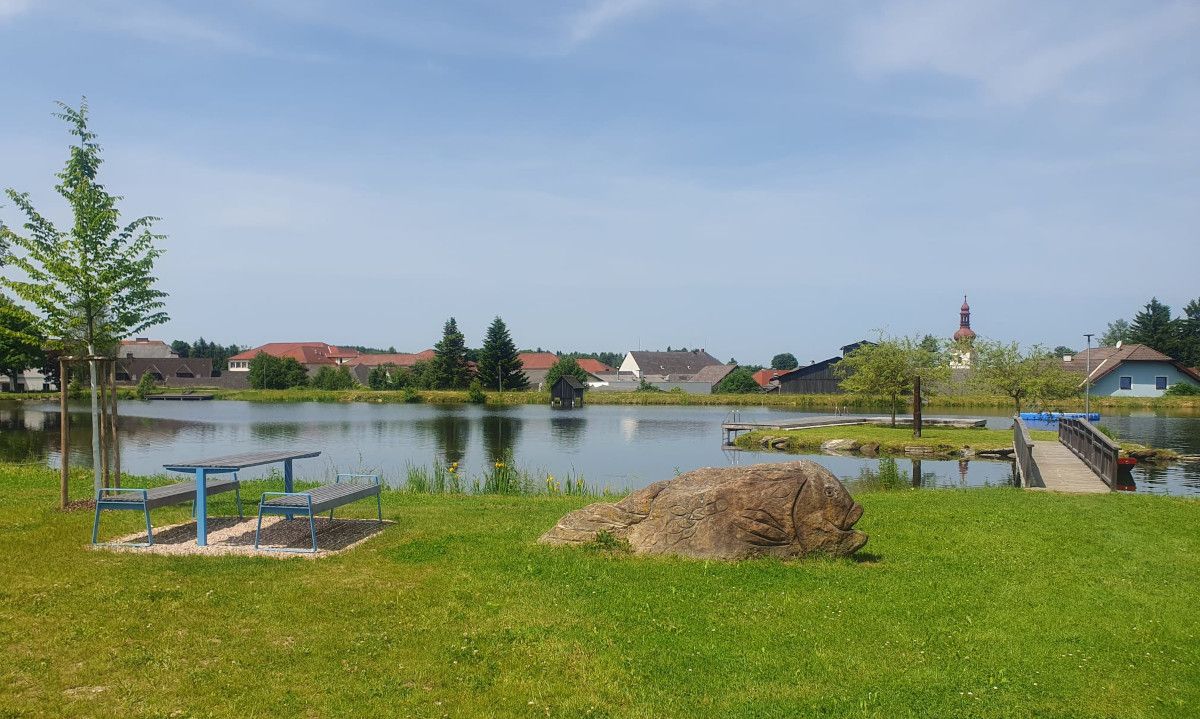 Der Teich ist malerisch gestaltet mit kleinen Buchten und einer zentralen Insel, die über einen Steg erreichbar ist. Zwei Springbrunnen, einer im Wasser bei der Insel und einer vor dem Feuerwehrhaus, sorgen für Abwechslung. Für Kinder (Kleinkinder) ist eine Wasserrutsche vorhanden und das Sprungbrett sorgt bei den "Großen" für Begeisterung. Ein breiter Gehweg und eine Beleuchtung um den Teich laden auch für Abendspaziergänge ein. In den Sommermonaten verwöhnt Sie unser „Teichstüberl“ mit Imbissen und Getränken, sodass Sie unbeschwert genießen können.