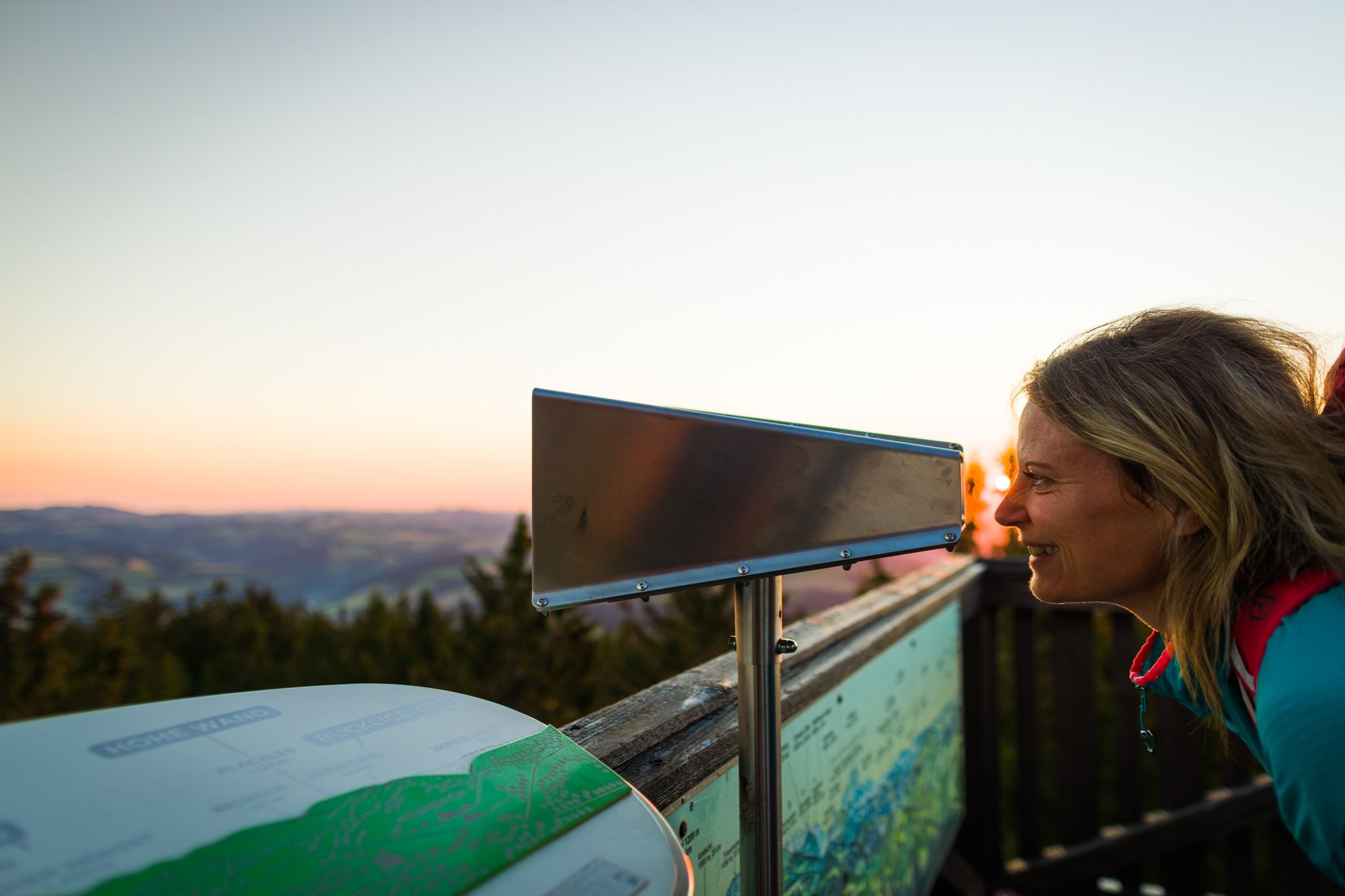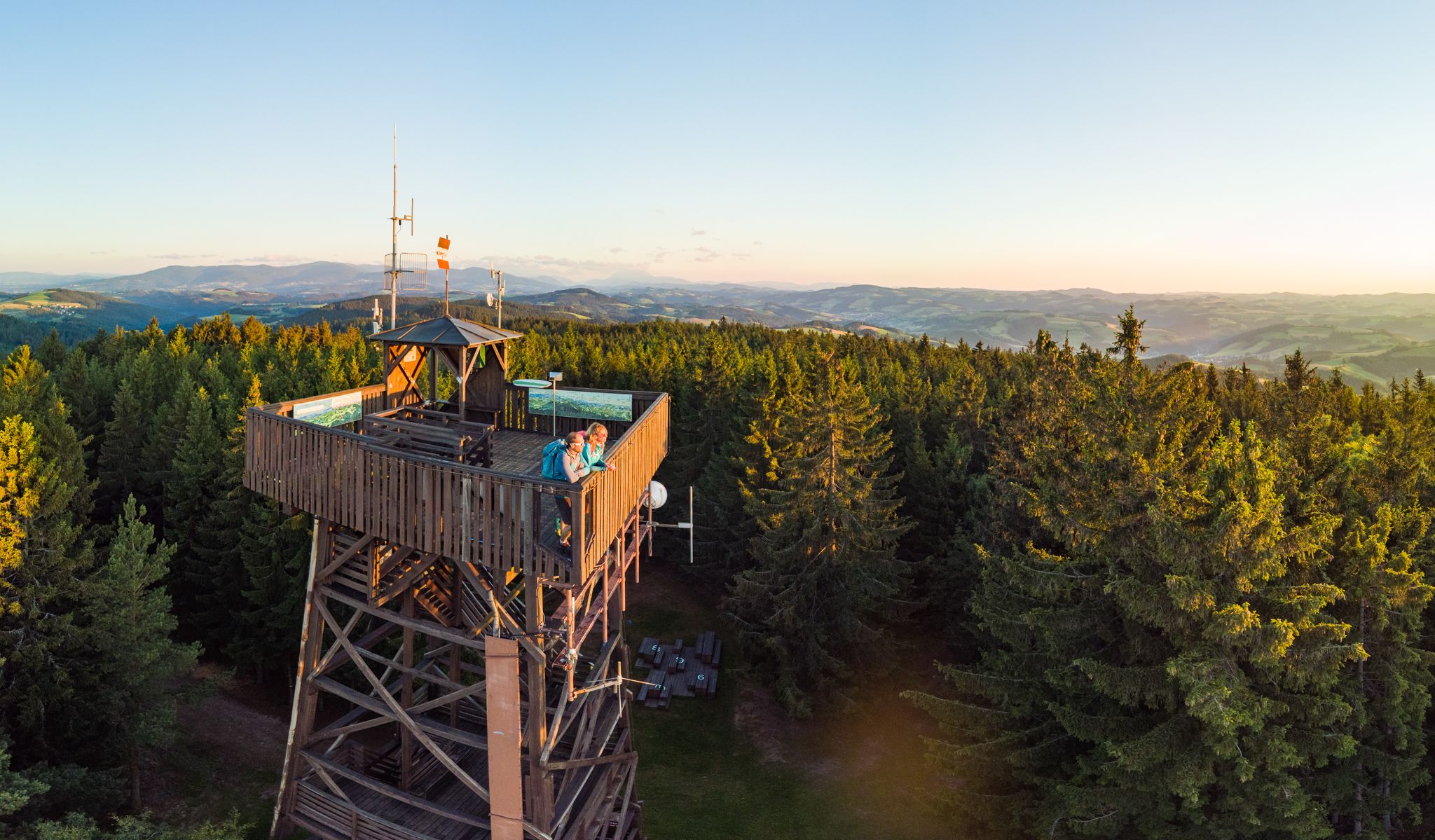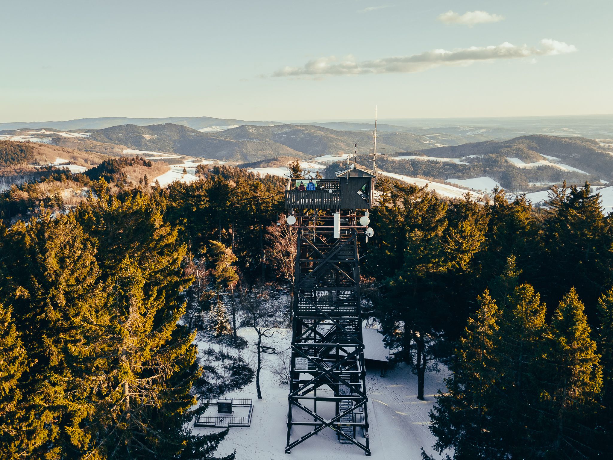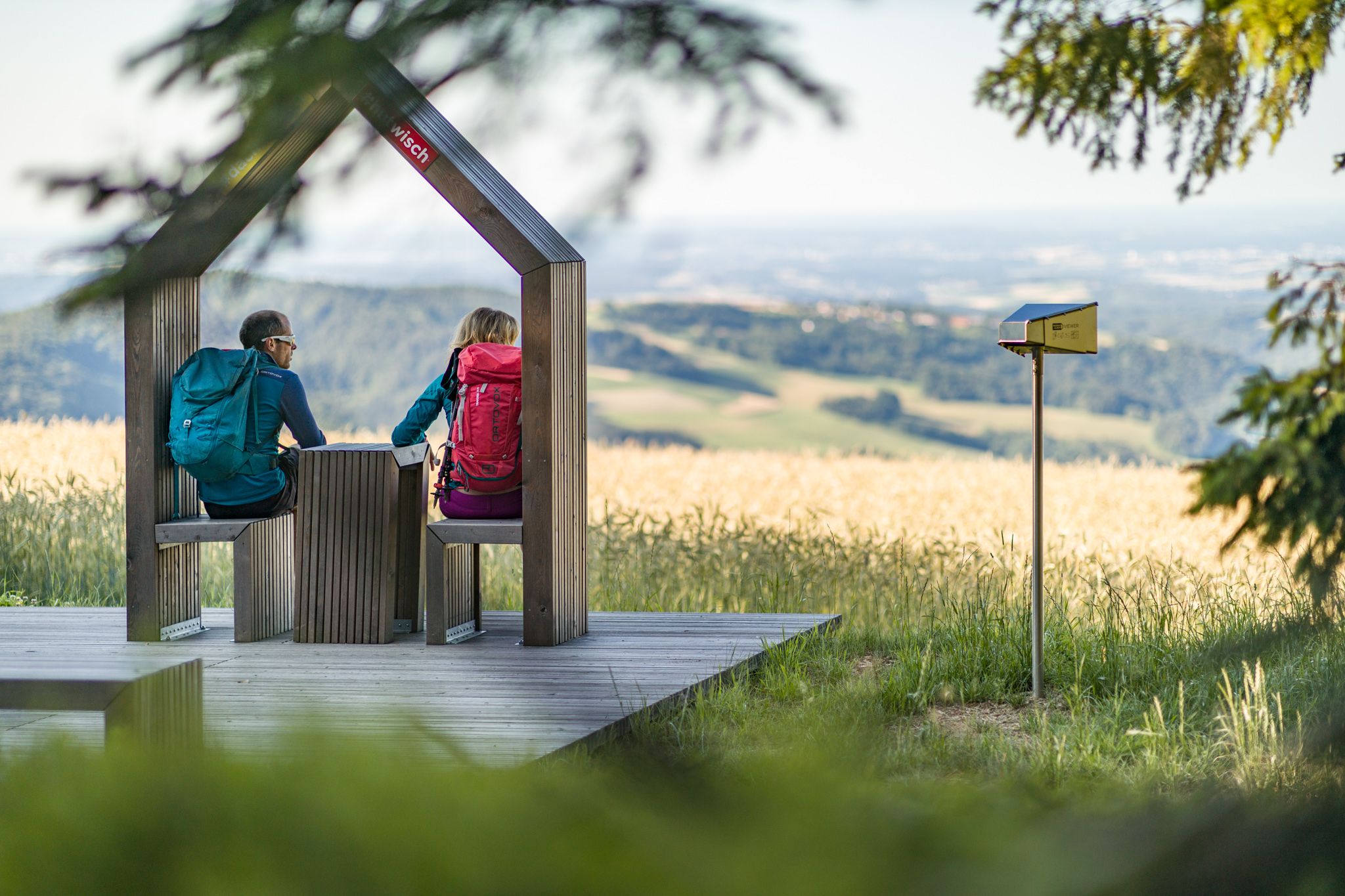 Ein atemberaubender Ausblick erwartet Besucher:innen auf der Plattform der Aussichtswarte am Hutwisch, der mit 896 Metern die höchste Erhebung der Buckligen Welt bildet. Von hier schweift der Blick weit über die sanften Hügel der Region, die Ausläufer der Alpen mit Wechsel und Schneeberg – und bei klarer Sicht sogar bis weit nach Ungarn und Slowenien.