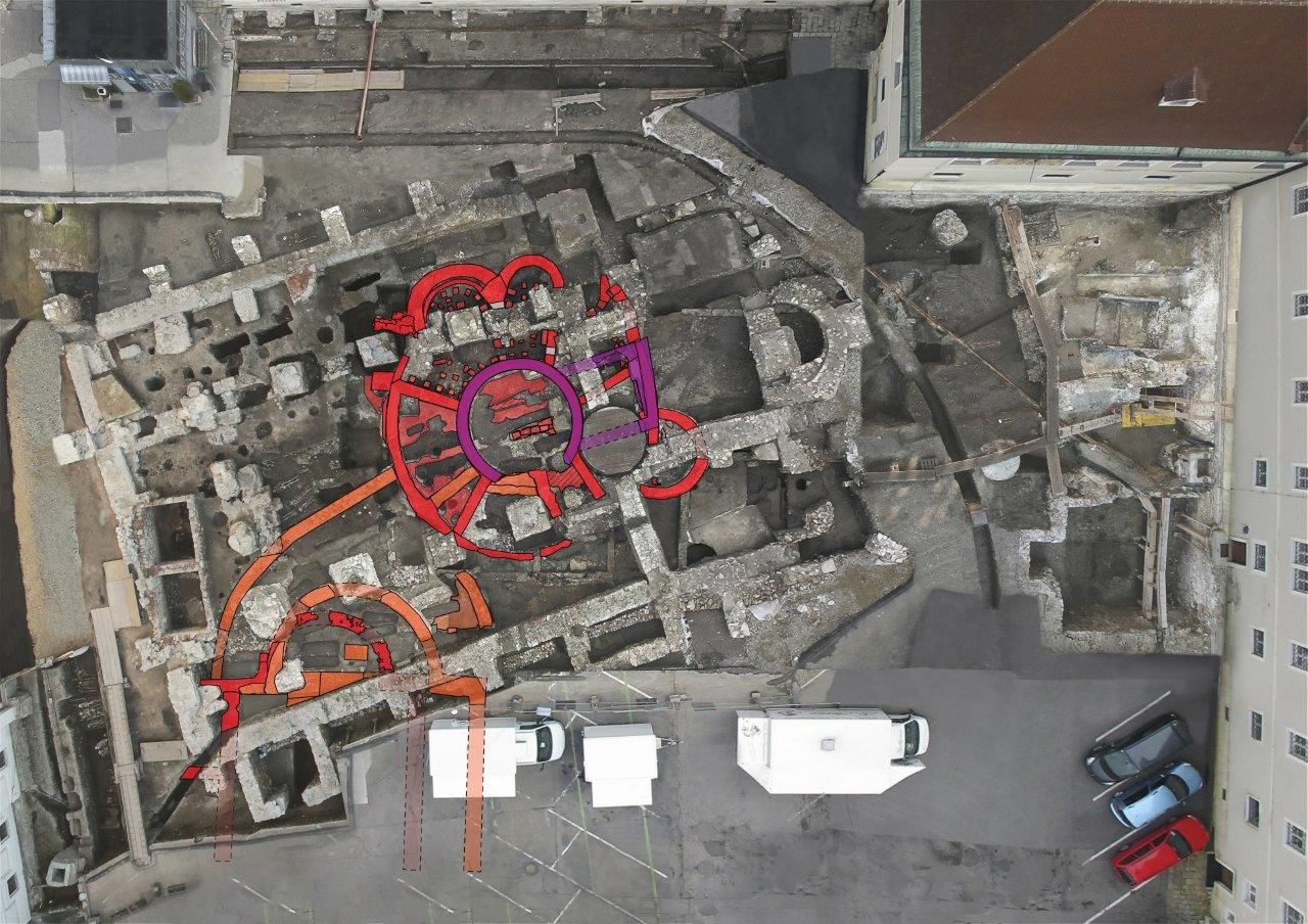 Die Grabungsstelle befindet sich in der Nähe des römischen Forums, das wahrscheinlich unter dem Herrenplatz lokalisiert werden kann. Bemerkenswert ist besonders die Entdeckung eines weitläufigen, mehrteiligen Gebäudes aus dem frühen 4. Jh. n. Chr., das über ein einzigartiges Badehaus sowie einen Verwaltungs- und Wohntrakt verfügte. Um 350 n. Chr. wurde die Anlage um einen repräsentativen Saal mit Apsis sowie weitere Räume mit Fußbodenheizung erweitert. Säle mit Apsis dienten der Repräsentation und finden sich üblicherweise in spätantiken Statthalterpalästen oder Kaiserresidenzen. Wie so viele der römischen Prachtbauten wurde auch dieser Palast in nachrömischer Zeit als eine Art Steinbruch verwendet: Die Anlage wurde im 9. Jh. zu einer Kirche umfunktioniert, auch die Nachfolgebauten nutzten römische Bausubstanz.