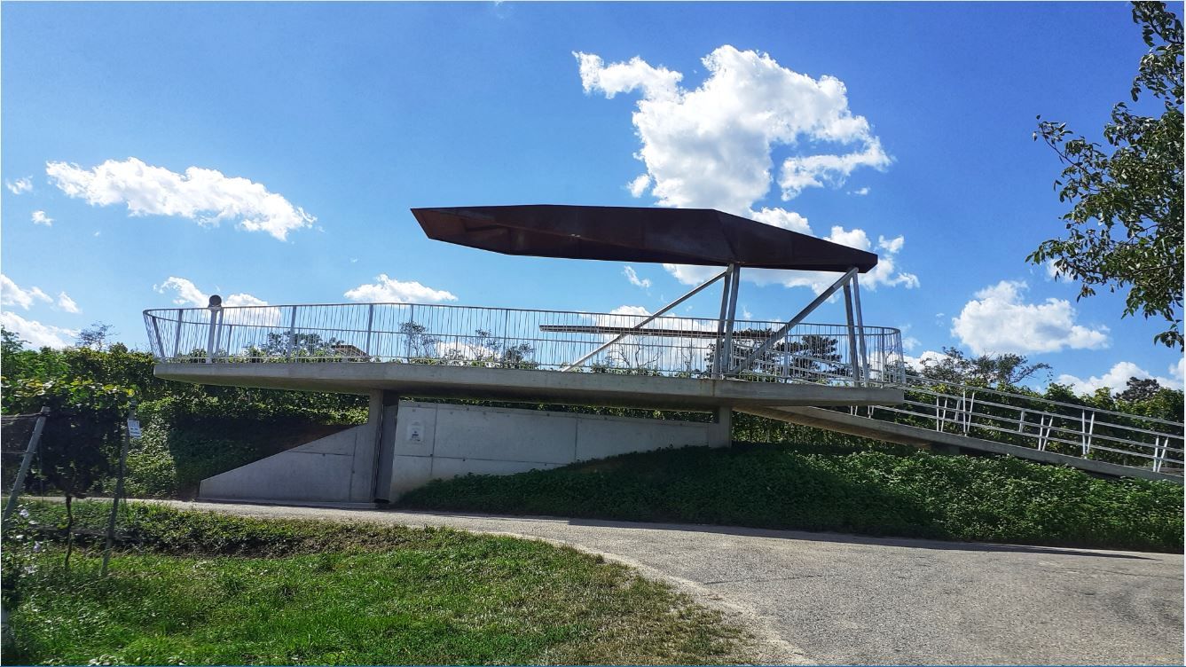 Die Aussichtsplattform Eisen.Hut thront auf der Riede Eisenhut, einem der höchsten Punkte am Wagram. Ihre markante Dachskulptur aus Corten-Stahl greift den Namen und die regionale Eisenvorkommen auf.