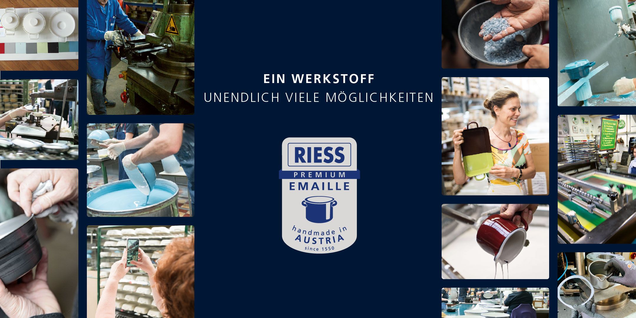 Bekannt für hochwertige Premium-Emaille-Qualität zertifiziert von der europäischen Emaille-Behörde und der Green Brand Organisation, produziert das Unternehmen Emaille Produkte für Küche, Haushalt und Wohnen, Emaille Schilder und maßgeschneiderte B2B-Produkte mit grüner Energie aus eigener Wasserkraft. Das Riess Produkt Sortiment umfasst über 900 Formen zum Kochen, Braten, Backen, Servieren und Aufbewahren und wird in über 35 Länder weltweit exportiert.