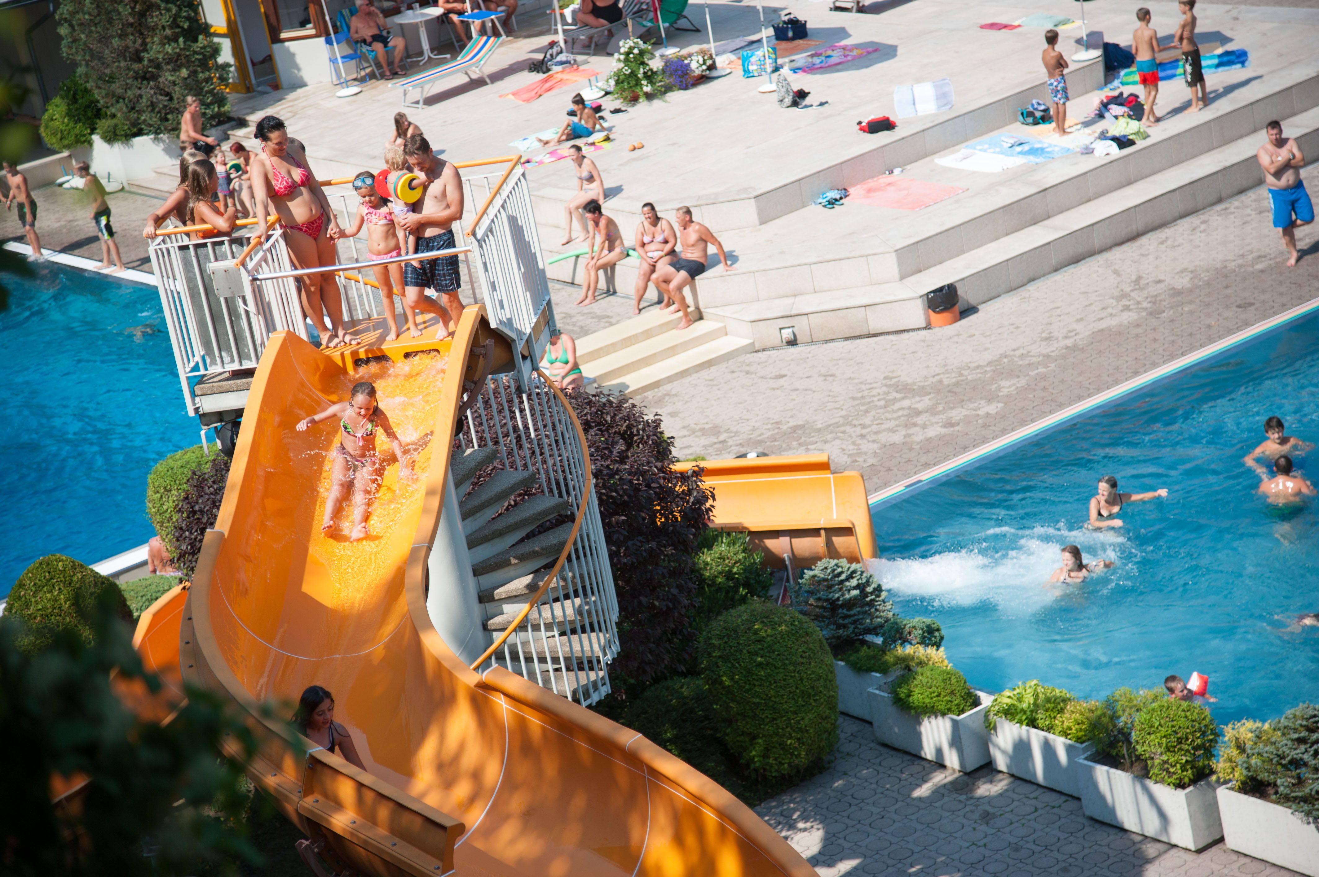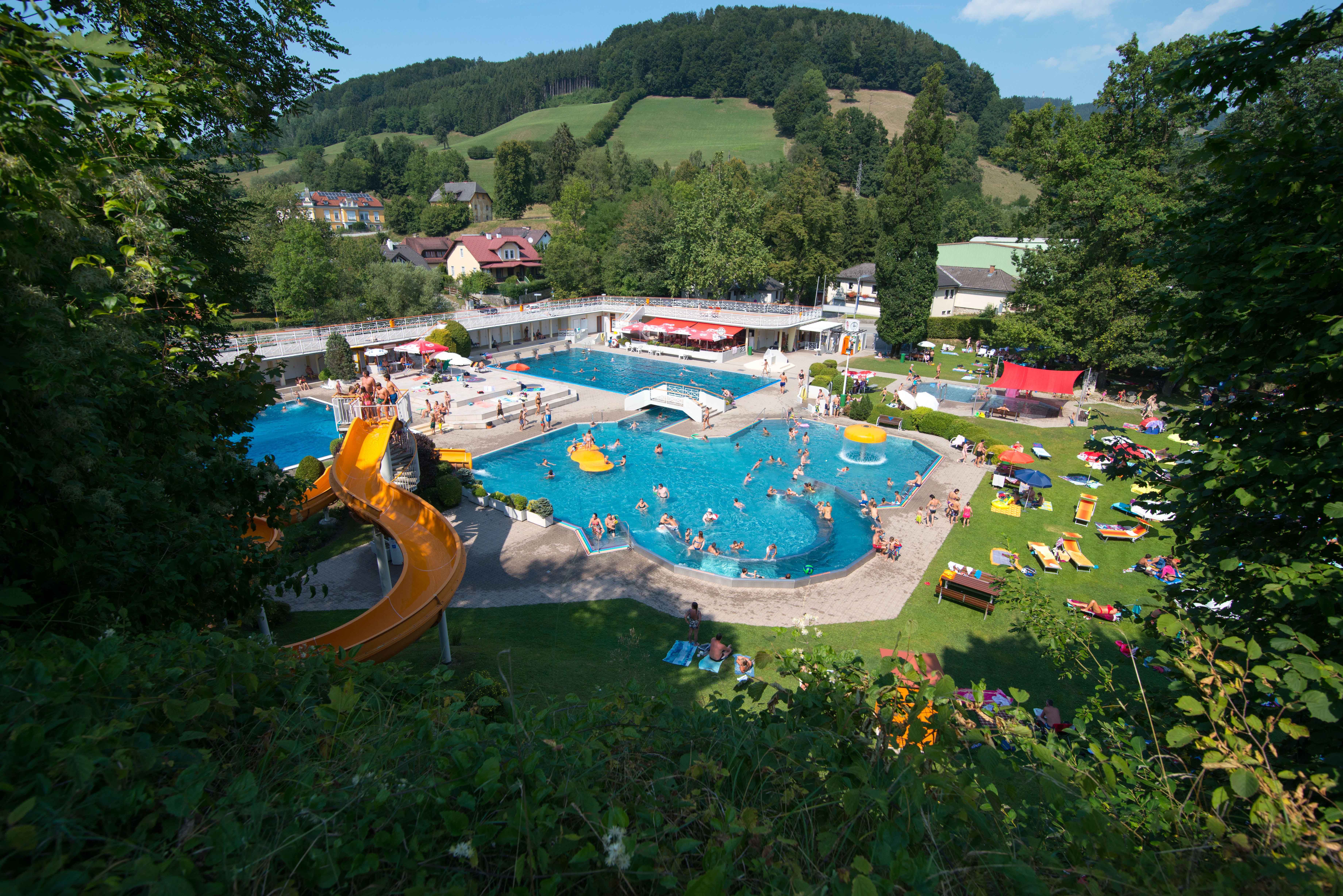 Hinein ins kühle Nass! Das städtische Parkbad wartet mit einem 5-Bahnen-Schwimmbecken, einem Erlebnisbecken mit Strömungskanal und einer 63-Meter-Rutsche, sowie einem Sprungbecken mit 1-, 3-, 5-, und 10-Meter-Turm auf seine Gäste! Es gibt auch ein eigenes Kinderbecken mit Eltern-Kind-Bereich und einem Beschattungssegel.