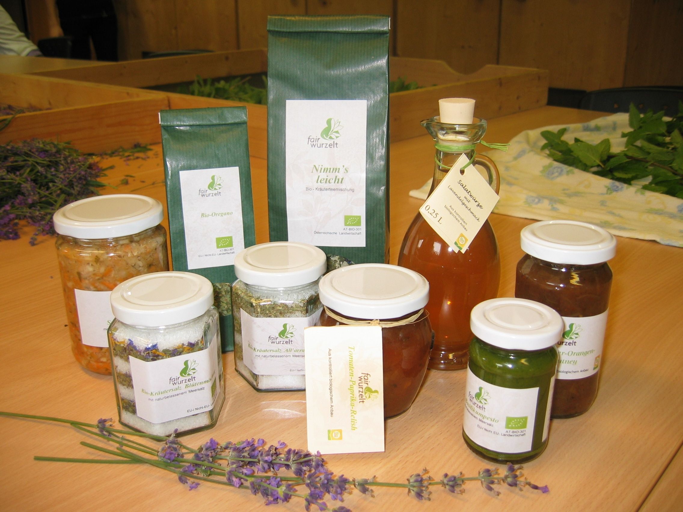 Die Vielfalt im Schaugarten des gemeinnützigen Projektes fairwurzelt (3000m² bewirtschaftet unter kontrolliert biologischen Kriterien) umfasst zahlreiche heimischen Pflanzen: Kräuter, Gewürze, Beerensträucher und Sommerblumen. Die Ernte wird zu unterschiedlichen Kräuterprodukten verarbeitet bzw. fairarbeitet, die Produktpalette ist groß: Kräutertees, Gewürzmischungen, Kräutersalz, Salatwürze, Suppenwürze, Pesto, Chutney und Relish, Badesalz.