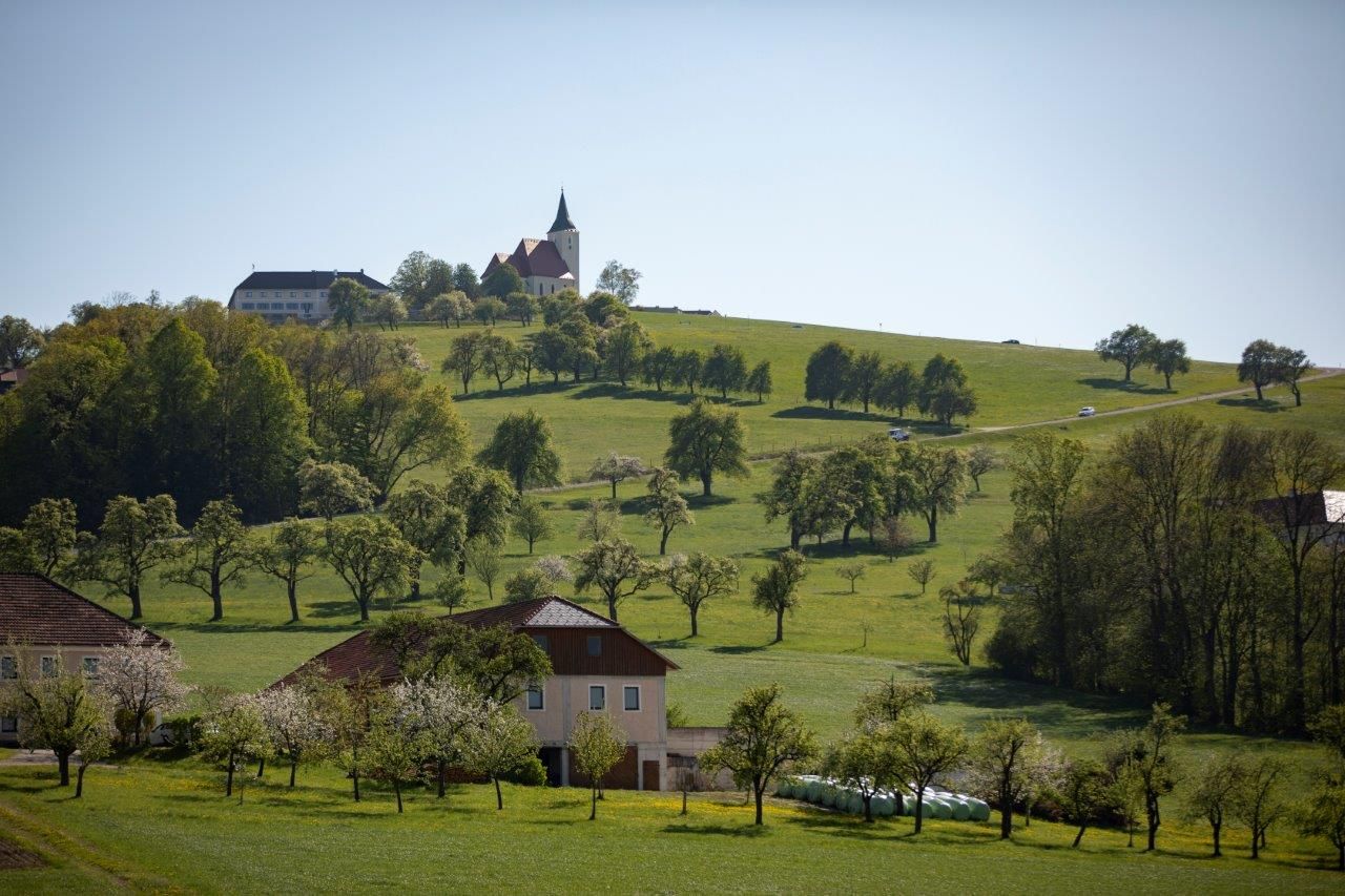 Die Kirche von St. Michael am Bruckbach ist umgeben von blühenden Birnbäumen.