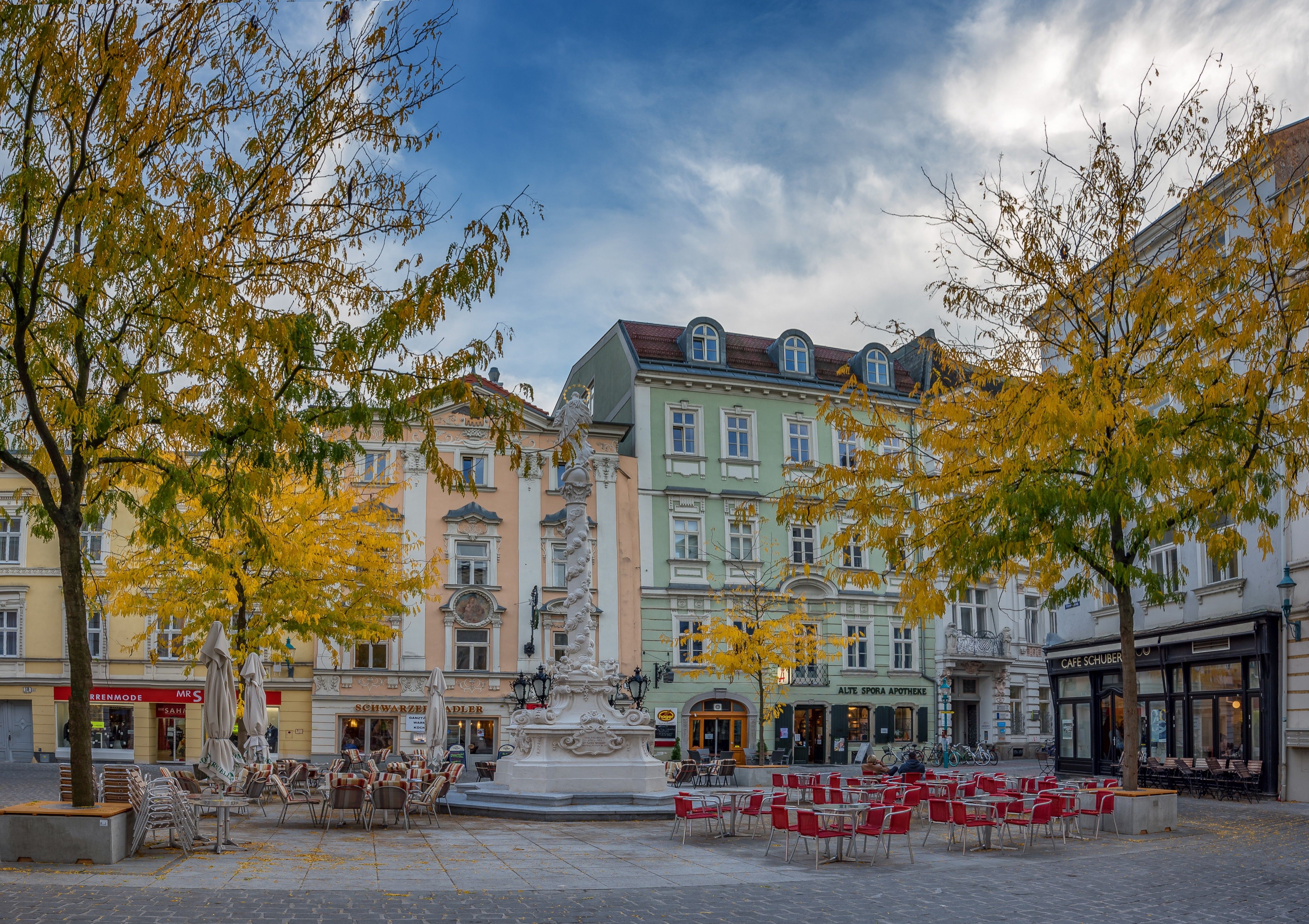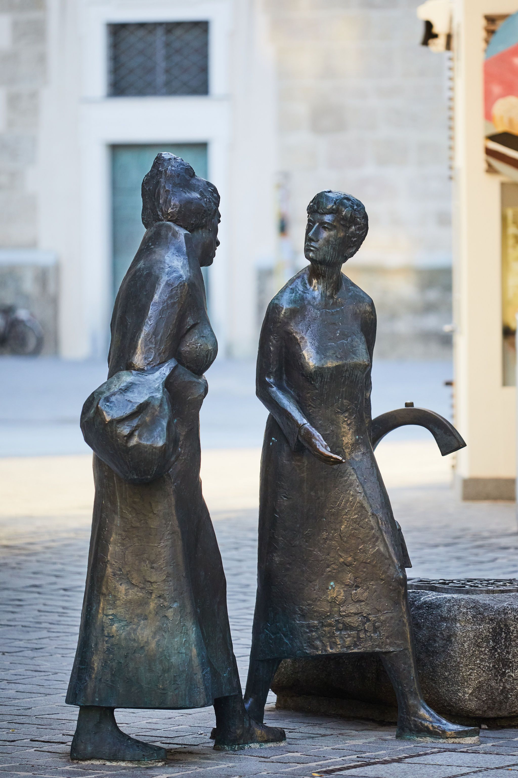 Gegenüber, in der nördlichen Ecke des Platzes, steht ein modernes Gegenstück zur barocken Symbolwelt: Die Skulptur „Tratschende Frauen“ von Hans Freilinger, 1990 geschaffen, ist ein beliebtes Fotomotiv – besonders bei Tourist:innen. Die humorvolle Szene fügt sich erstaunlich gut in das historische Ambiente und betont, dass der Herrenplatz nicht nur ein Ort der Vergangenheit, sondern auch ein Platz der lebendigen Gegenwart ist.
