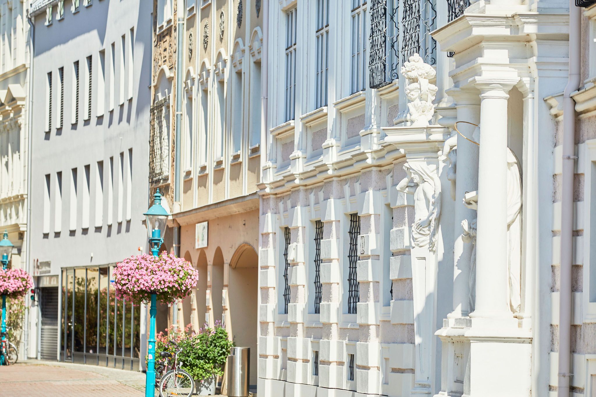 Straße mit historischen Gebäuden und Statuen in einer Stadt.