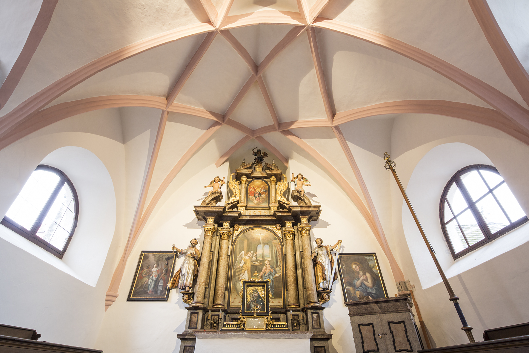 Über den Vorraum betritt man die Empore mit dem Blick auf den etwa quadratischen Kapellenraum. Das polygonale Netzrippengewölbe verrät die spätgotische Herkunft der Kapelle. Der frühbarocke Hochaltar trägt Statuen aus der Werkstatt des bekannten Bildhauers Matthias Schwanthaler. Das Altarbild »Verkündigung Mariens« ist jung, aus 1896. Die beiden Seitenaltäre haben links das Altarbild hl. Florian, rechts hl. Leopold mit einer frühen Ansicht des Stiftes Melk noch vor seinem barocken Umbau.