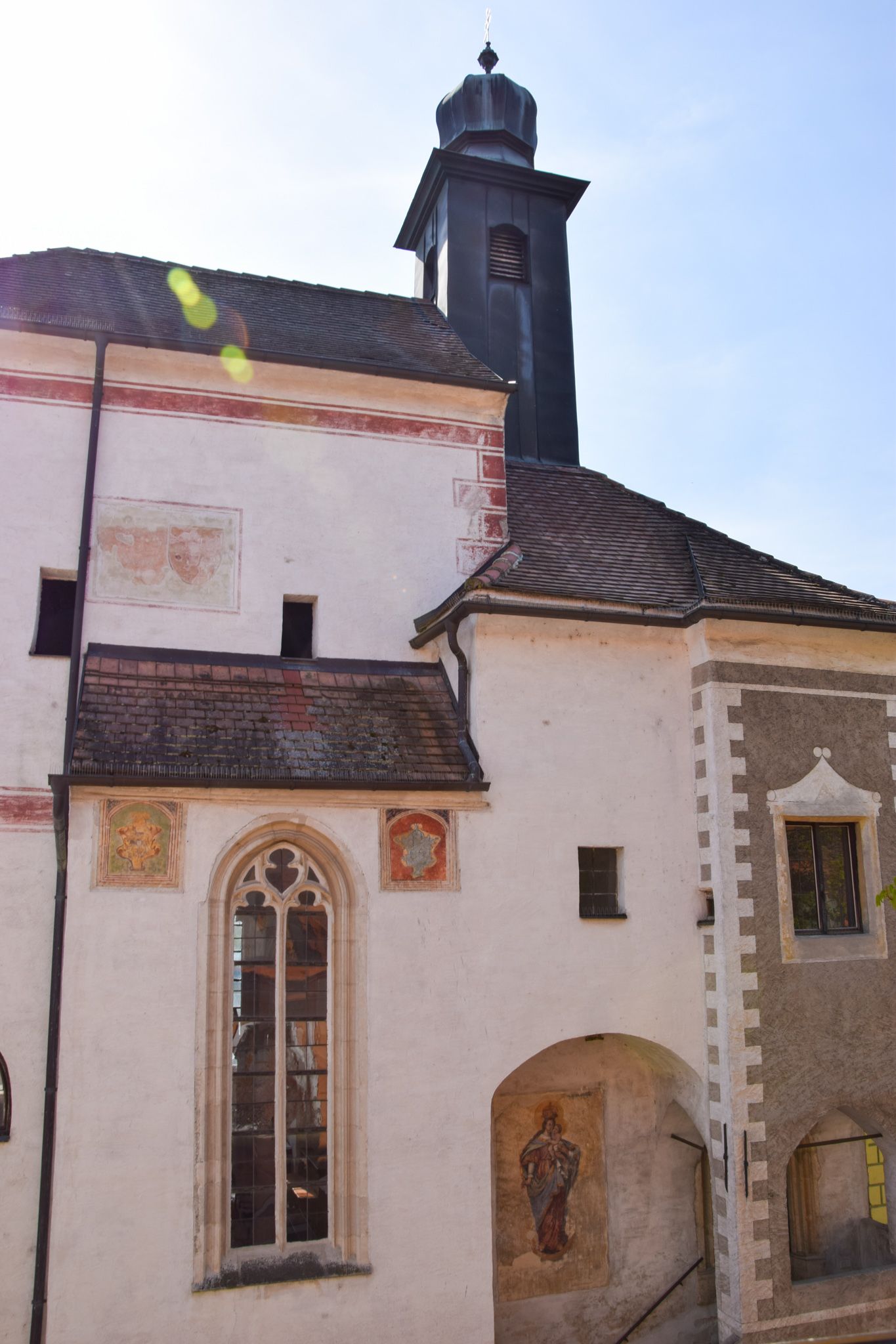 Man geht über einen steilen Stiegenaufgang zur loggienartigen Vorhalle und zum Spitzbogenportal. Offenbar sollte die Kapelle hochwassersicher sein. Die Wappen an der Fassade zeigen die adelige Stiftung, das Fresko der Immakulata die Widmung als Marienkapelle.