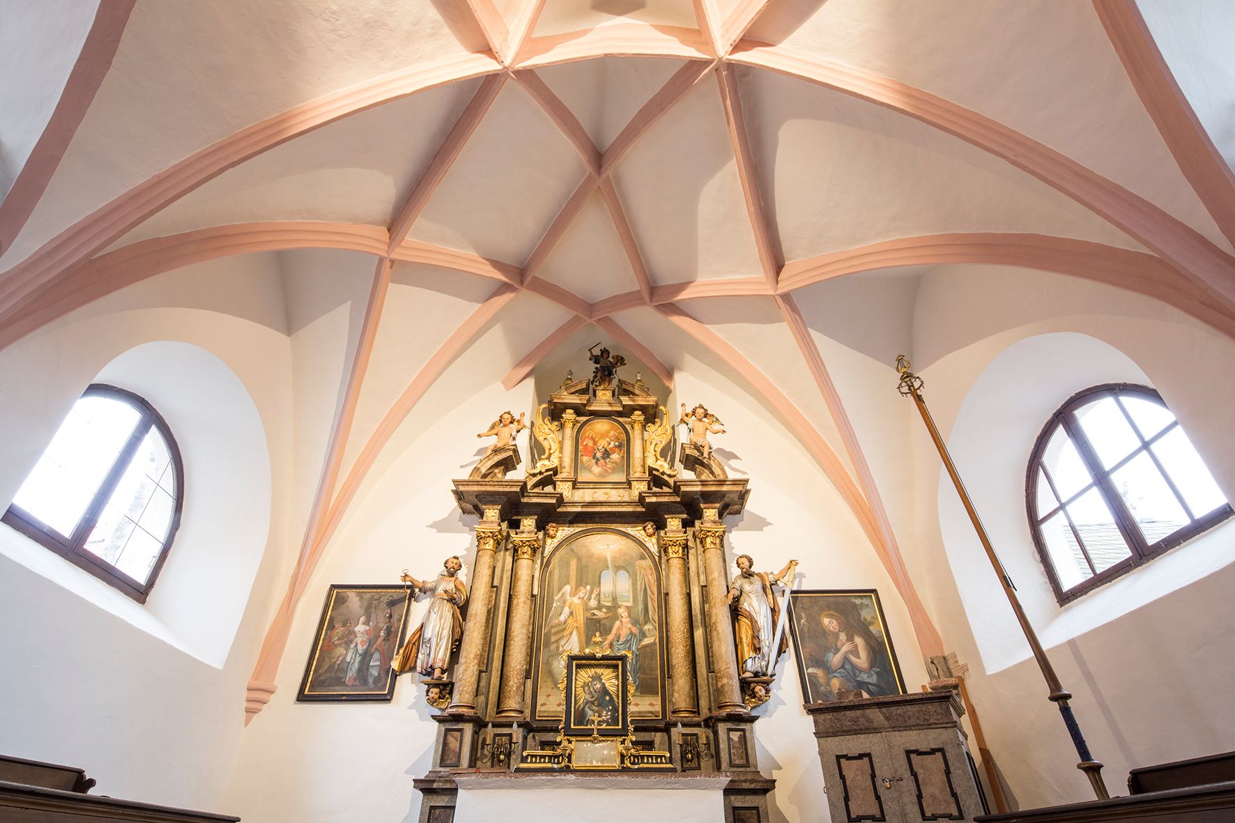 Die Kapelle wurde 2015 neu renoviert. Im Zuge der Renovierungs- arbeiten wurden Fresken aus dem 15. Jahrhundert freigelegt.