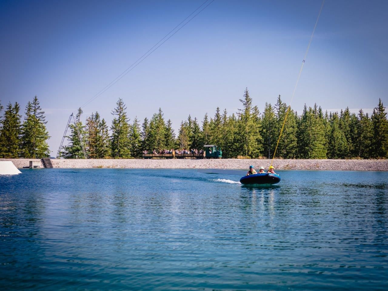 Der Wasserskilift WakeAlps auf dem Kristallsee für Wakeboard, Fliegender Teppich und Co macht das Bergabenteuer komplett.