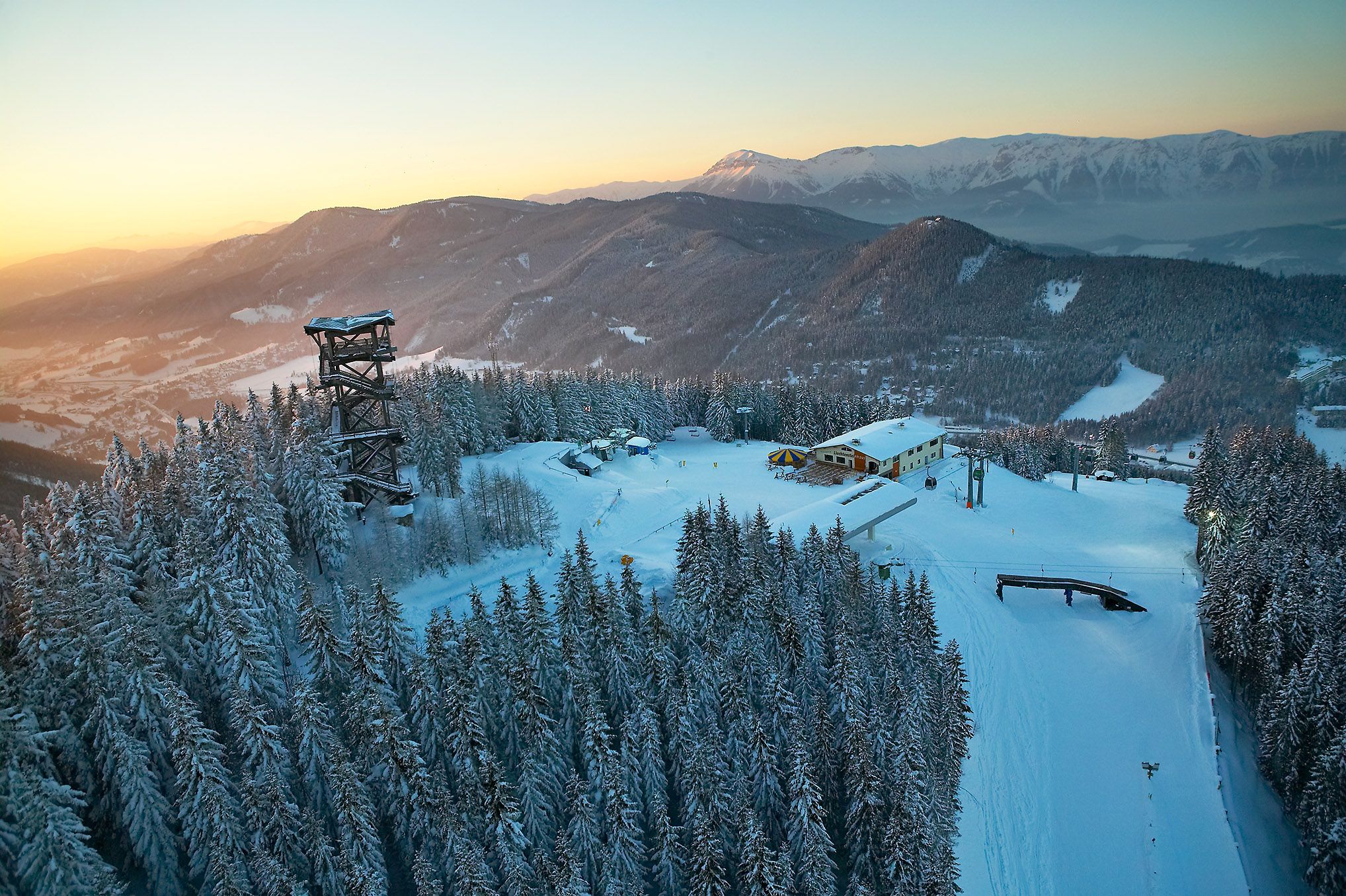 Die Millenniumswarte befindet sich am höchsten Punkt des Hirschenkogels auf 1.340 Metern. Von der 25 Meter hohen Aussichtsplattform überblickt man das Semmering-Rax-Massiv und sieht an klaren Tagen bis nach Ungarn.
