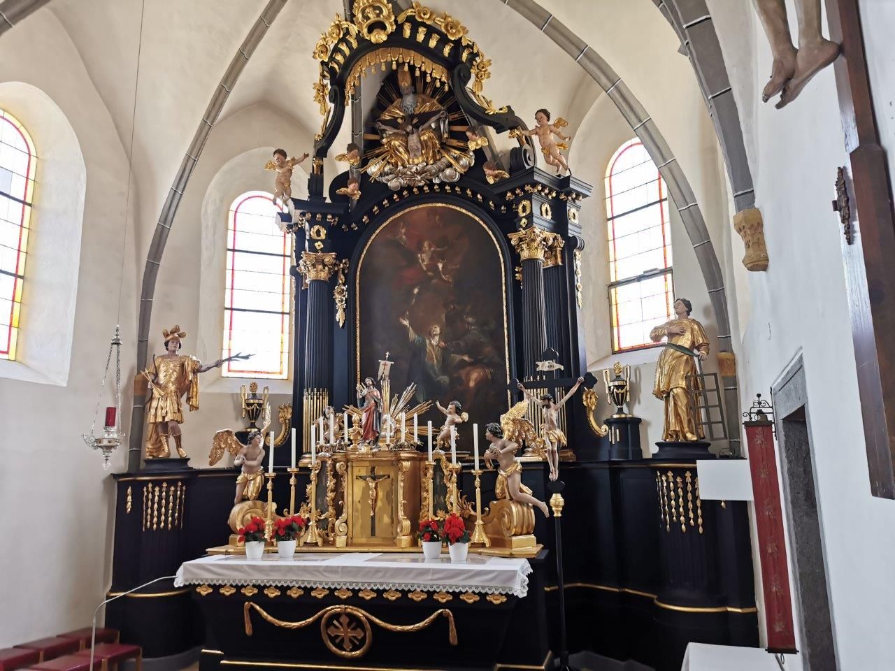 Altäre: Spätbarocker Hochaltar in schwarz-goldener Fassung, das Hochaltarbild zeigt die „Steinigung der Hl. Stephanus“ von Martin Johann Schmidt aus dem Jahr 1792. Auf den Postamenten stehen links der „Hl. Sebastian“ und rechts der „Hl. Laurentius“.