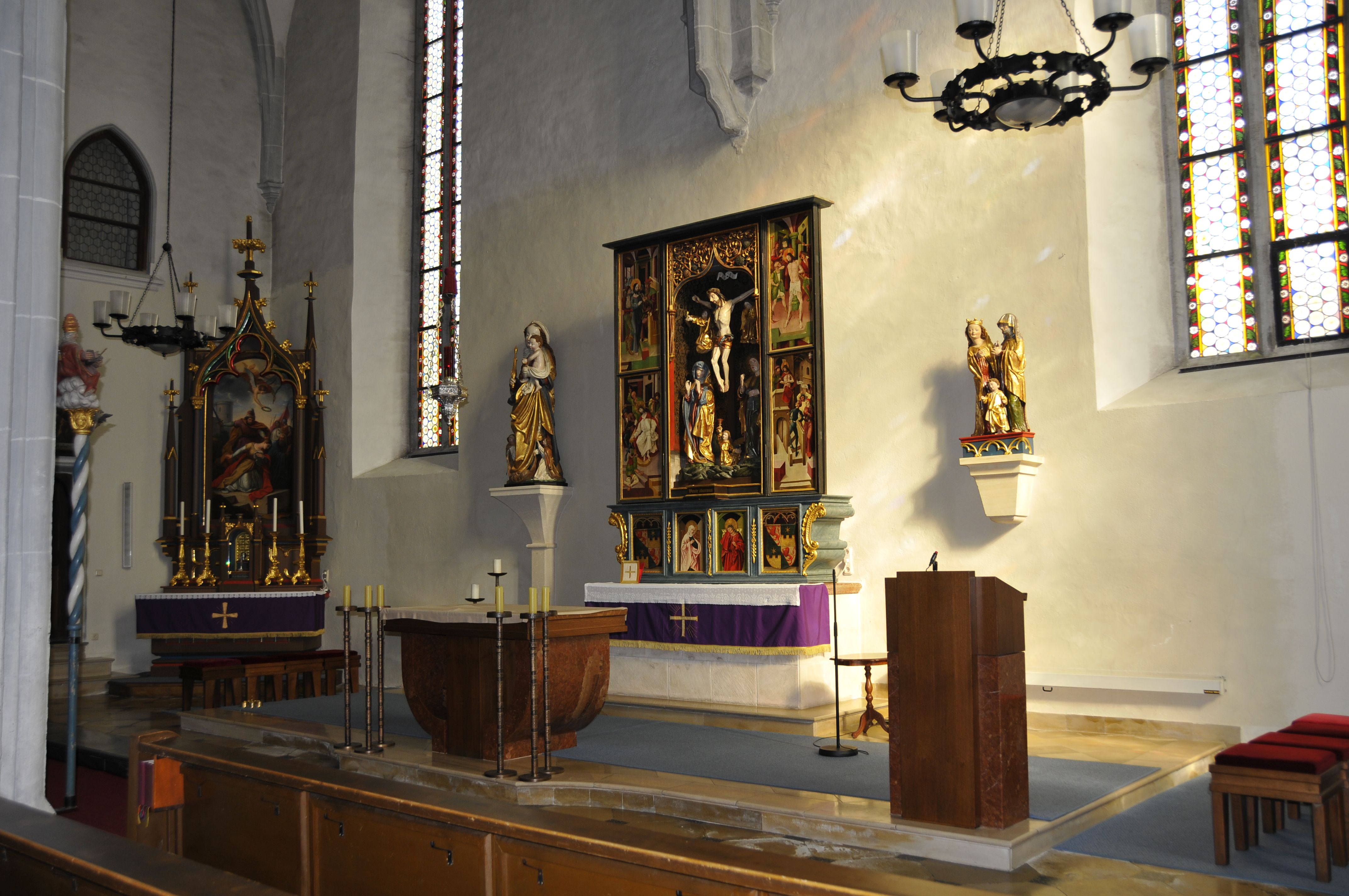 Die Kirche birgt bedeutende Werke der Spätgotik: Hochaltar mit bemalten Flügeln und einer Kreuzigungsgruppe im Schrein, Maria mit dem Kind, Figurengruppe „Anna Selbdritt“, Westempore mit Seccomalereien, hölzerne Seitenemporen, Ratsherrenstühle u. a. An der südlichen Außenwand befindet sich ein mächtiges Sankt-Christophorus-Fresko.