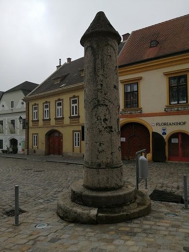 An der Südostecke des Rathauses steht ein fünf Meter hoher Pranger, eines der eindrucksvollsten rechtsgeschichtlichen Denkmäler Niederösterreichs. Er wurde 1563 (Jahreszahl eingemeißelt) als Nachfolger eines wesentlich einfacheren Prangers aufgestellt.