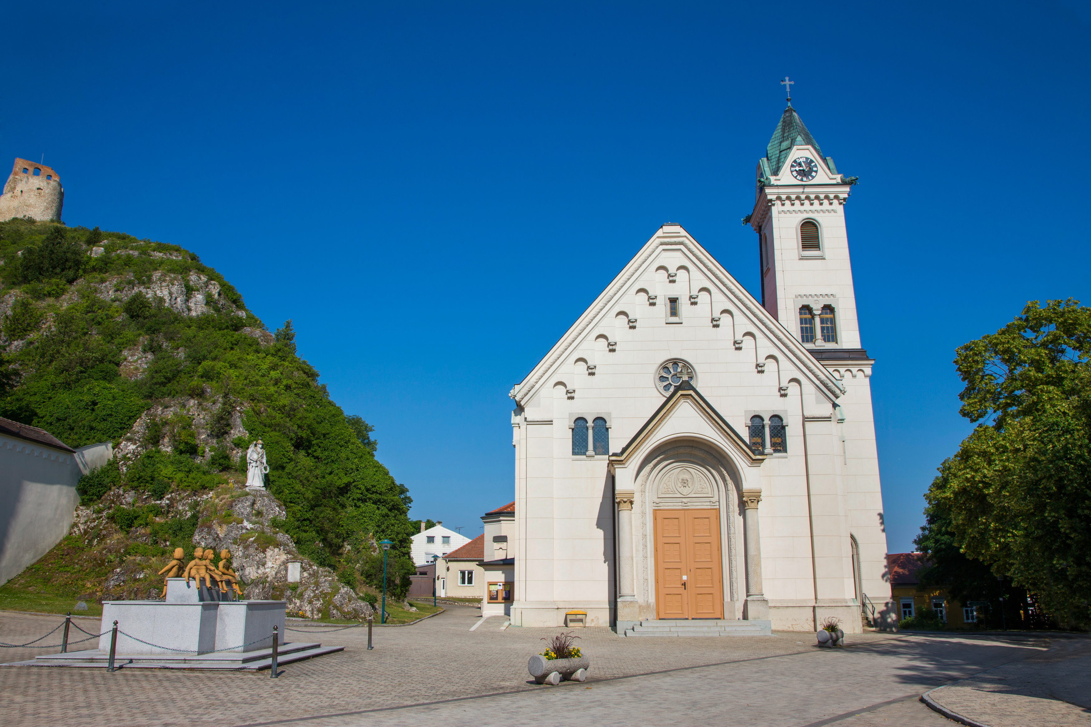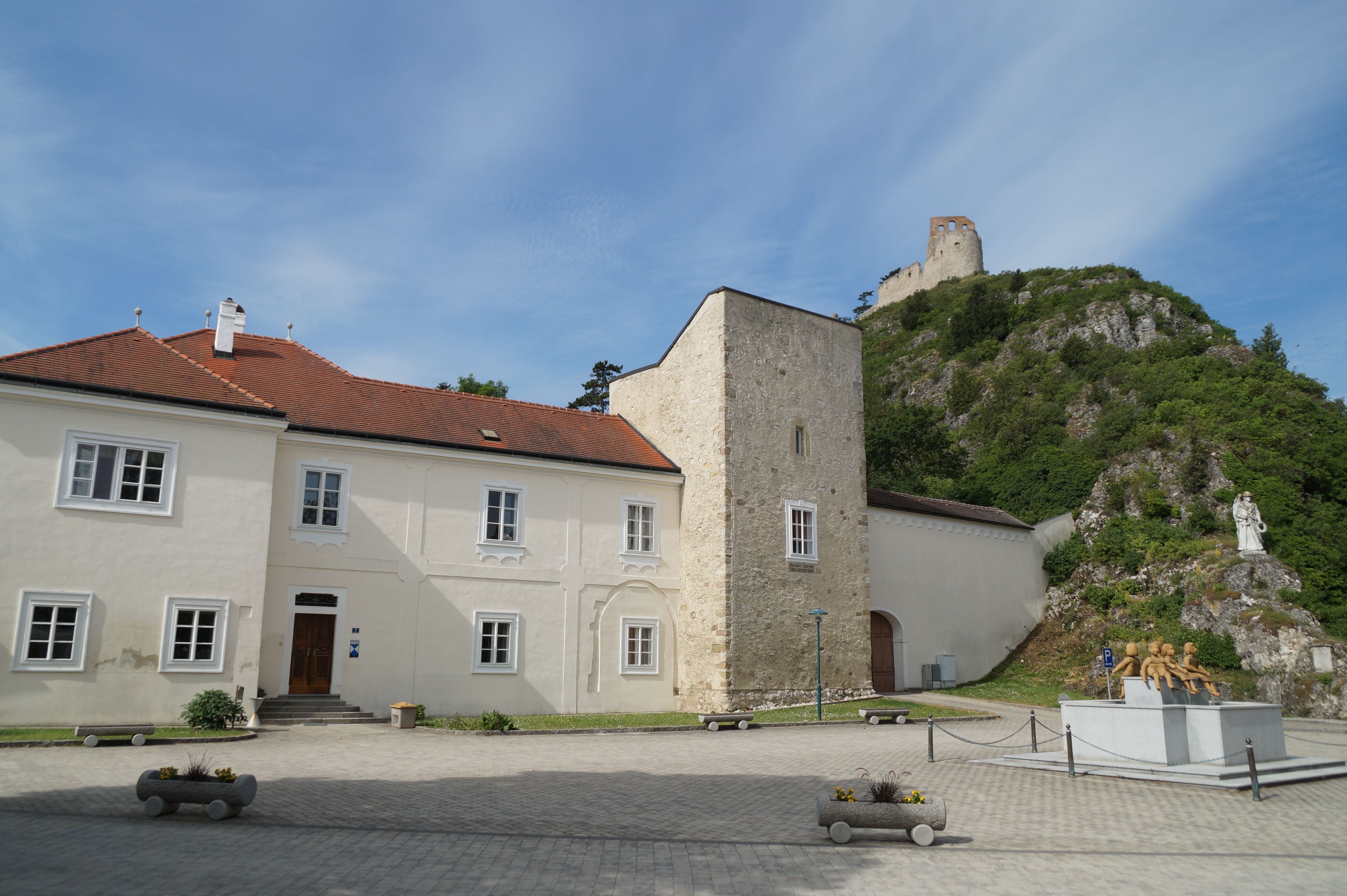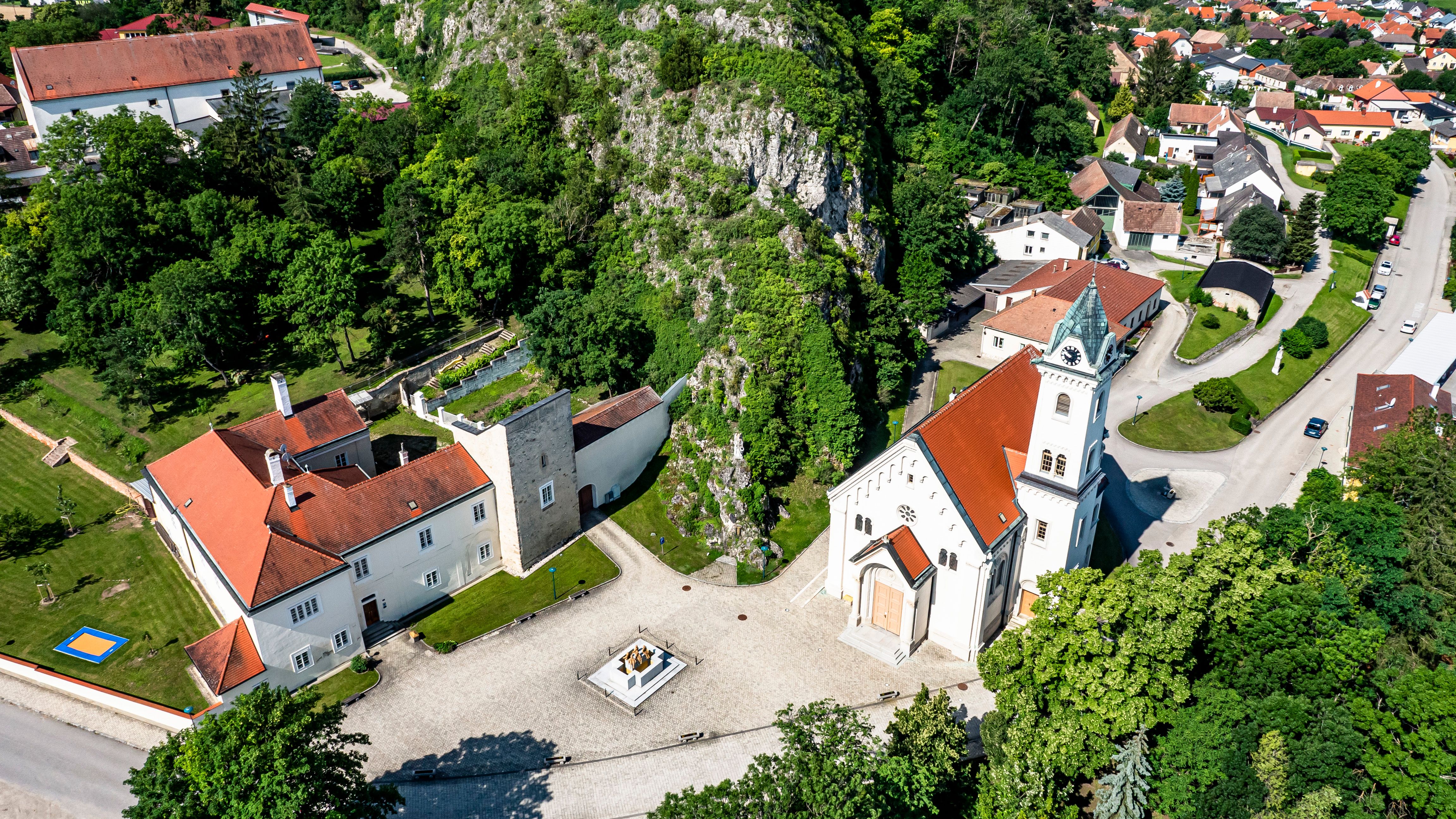 Links vor der Kirche befindet sich der barocke Pfarrhof mit einem mittelalterlichen Wohnturm, dessen Aufschrift unter dem Fenster auf eine Bauzeit um 1412 hinweist