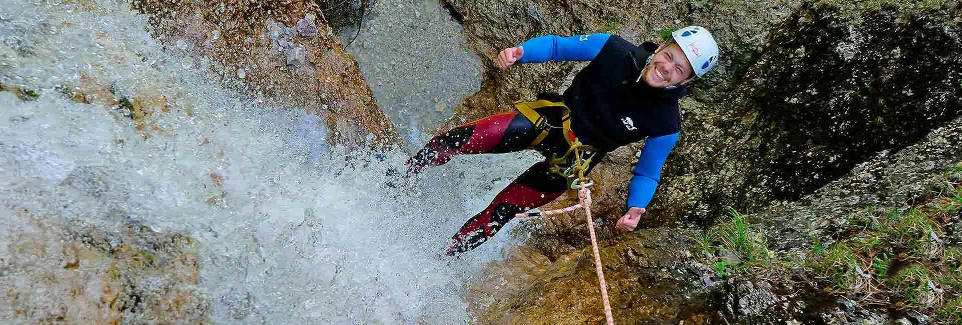 Beim Canyoning werden faszinierende Schluchten hautnah erlebt. Bei der abenteuerlichen Wanderung durch den Wildbach tauchen sie ein in eine außergewöhnliche Landschaft aus glitzernden Wasserfällen und glasklaren Naturpools. Ausgerüstet mit warmer Neoprenanzügen ist das für jeden der sich im weglosen Gelände bewegen und schwimmen kann ohne weiteres möglich. Der Guide sorgt für die Sicherheit und lässt die Teilnehmer mit dem Seil über spritzige Wasserfälle abwärts. Naturrutschen und Sprünge in Wasserpols sorgen für Abwechslung bei der Canyoningtour. Die Landschaft ist atemberaubend und nur beim Canyoning in dieser Form erlebbar.Hochseilgarten