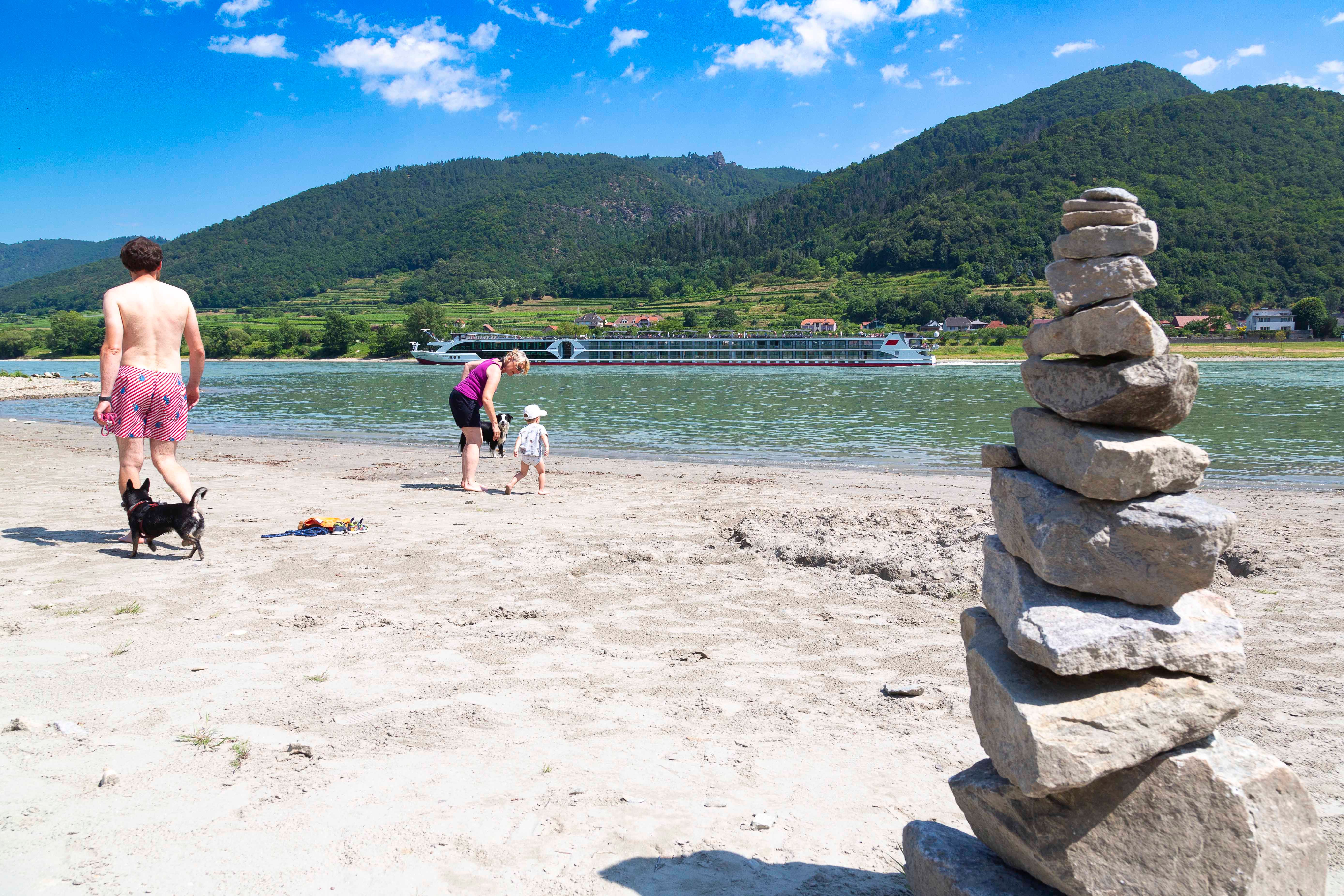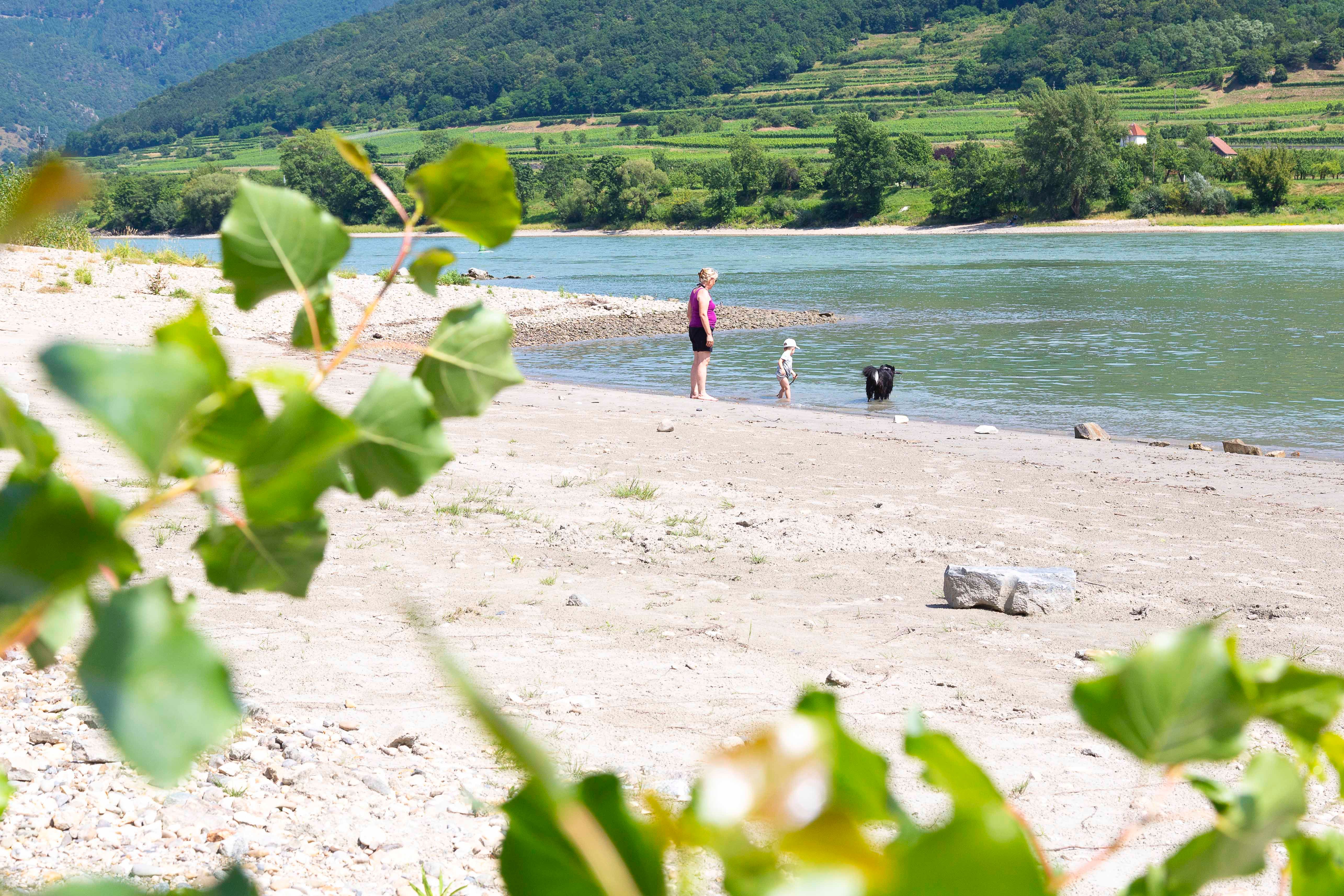 Unterhalb der Ruine Hinterhaus in unmittelbarer Nähe der Bundesstraße B3 offenbart sich bei Niedrigwasser ein schöner Sand-Schotterstrand. Ein paar Stiegen führen zu diesem Abschnitt der Donau hinunter. Für eine Erfrischung im Donauwasser oder für kurzes Urlaubsfeeling ist dieser Platz ideal, auch für Hunde geeignet.