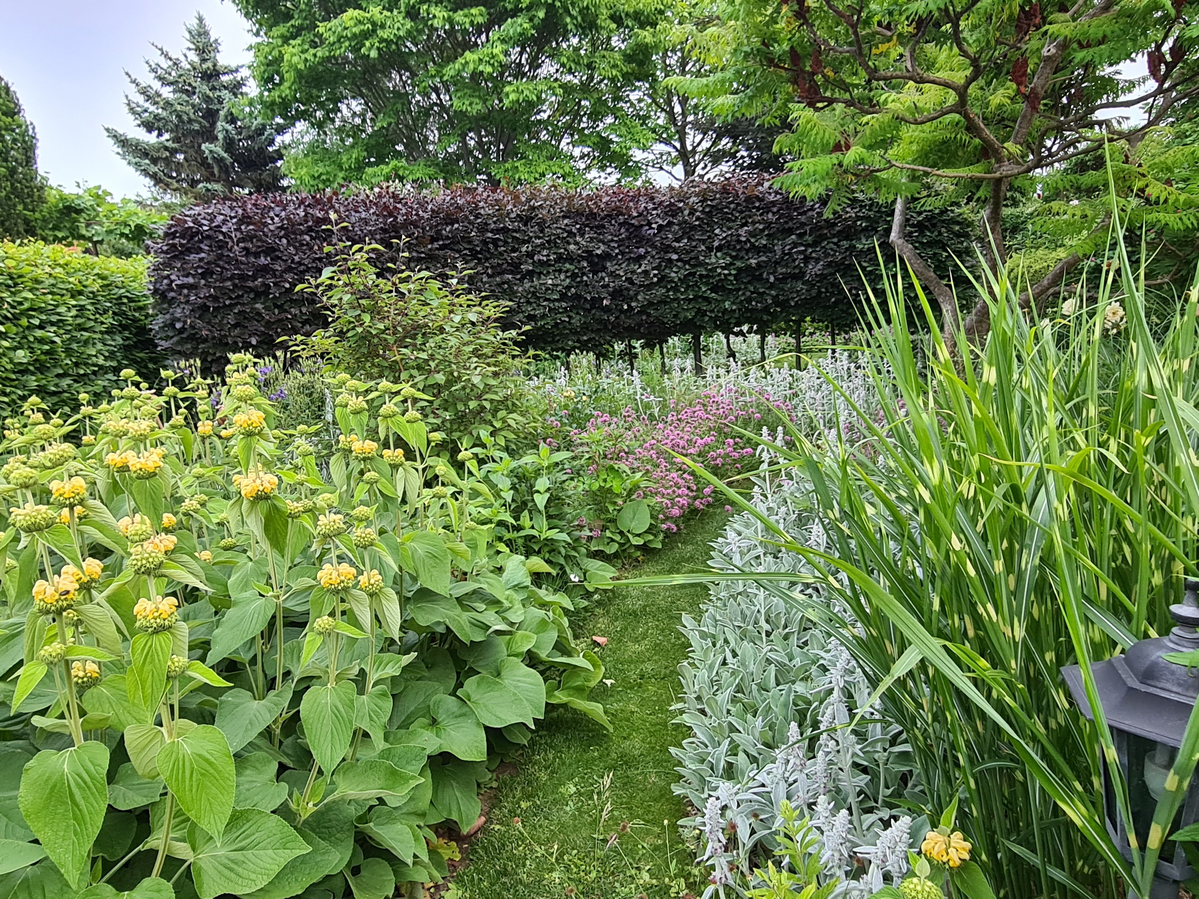 Ein durchdachtes Wegenetz, begleitet von üppigen Blumenbeeten erschließt das gesamte Areal. Hecken gliedern den Garten in Räume und schaffen Blickachsen. In den letzten Jahren entstanden weitere architektonische Elemente aus alten Ziegeln, sowie zahlreiche Sitzplätze, ein symmetrischer Gemüsegarten, ein mit Buchs eingefasstes Rosenrondell und ein Senkgarten, bepflanzt in den Farben des Regenbogens. Leitpflanzen sind Buchs, Rosen, Lilien, Funkien, Storchschnabel und Gräser. Entsprechende Beleuchtung und die Verwendung von vielen weiß blühenden und silberlaubigen Pflanzen bringen den Garten nachts zum Strahlen. Frühe Frühlingsboten, üppige Sommerblüher, bunte Herbstfarben und bizzare Wintergestalten schaffen stets neue Gartenbilder und lassen den Garten zu jeder Jahreszeit attraktiv erscheinen.