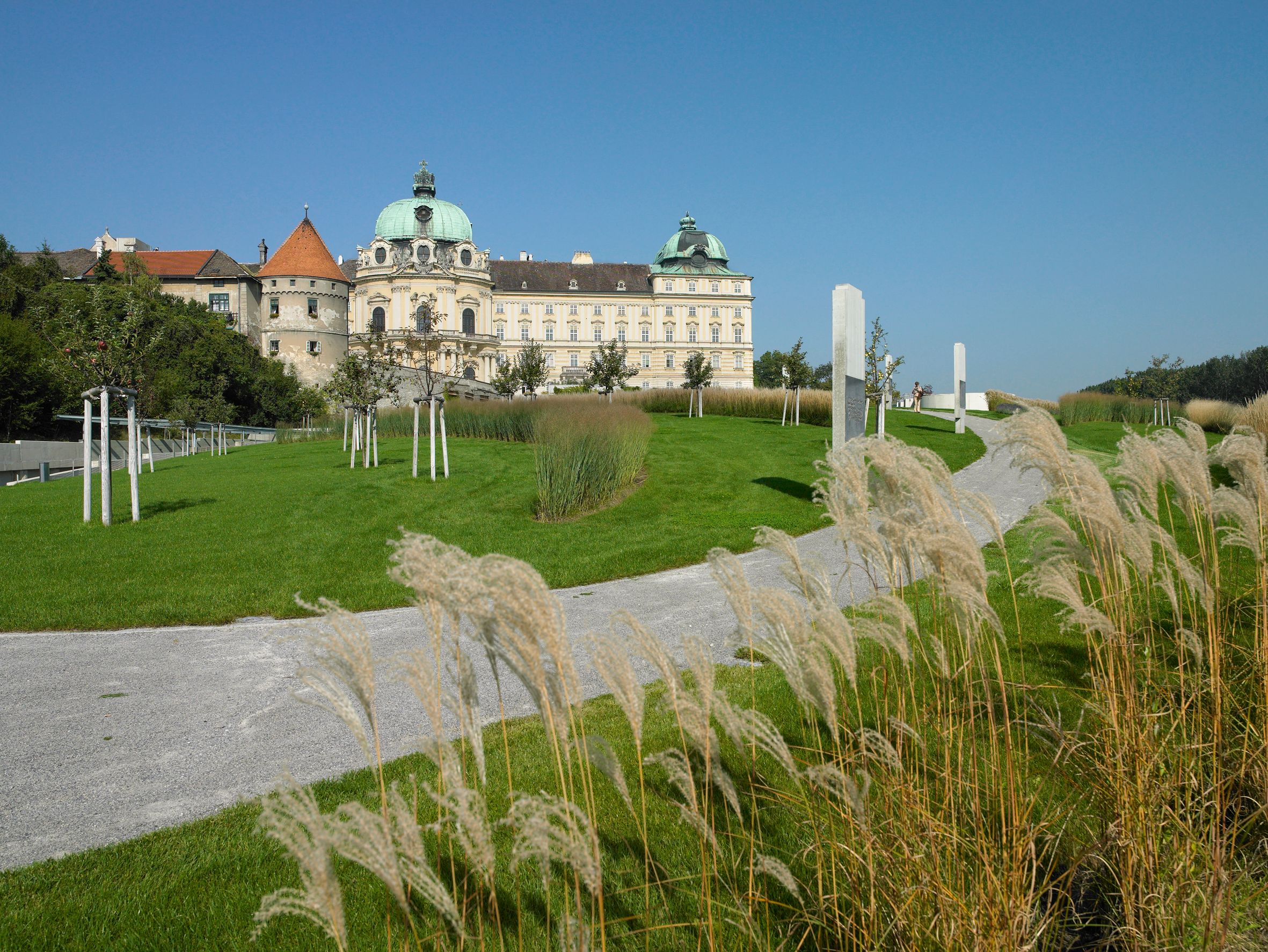 Bereits beim Betreten des Stiftes Klosterneuburg durch die Sala terrena eröffnet sich der Blick auf die vielfältige Gartenlandschaft des Stiftes. Den Auftakt bildet der moderne Teichgarten, in dem Tausende Blumen und Gräser zu einer biblisch inspirierten „Lilie des Feldes“ gestaltet sind. Einen bewussten Kontrast dazu setzt der Konventgarten, der im 19. Jahrhundert im englischen Stil am damaligen Donauufer angelegt wurde. Er diente den Chorherren als Ort der Erholung und beherbergt heute neben einem der größten Ginkgobäume Österreichs die klassizistische Orangerie von Joseph Kornhäusel sowie einen Springbrunnen.