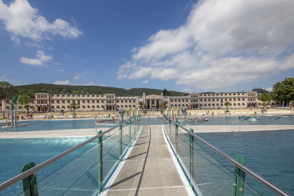 Den totalen Badespaß garantieren zwei 50m-Schwimmbecken, zwei Schwefelbecken, Massagedüsen in verschiedenen Höhen, ein Strömungskanal, Bodengeysire, Massageliegen auf der Palmeninsel, eine große Wasserrutsche, eine Breitwasserrutsche, ein Sprungturm, ein Kinderbecken mit Wasserpilz und Rutsche.