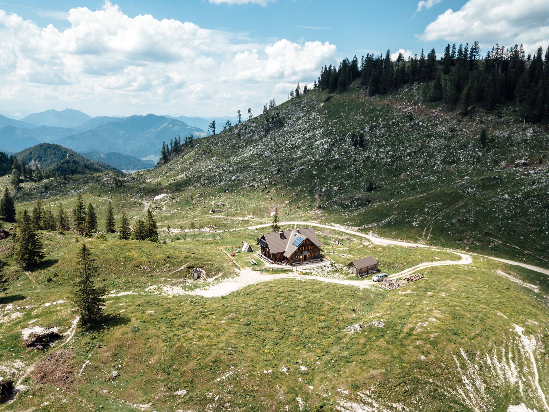 Über eine sanfte Schwaigenlandschaft zieht sich der Weg vom Biotop in Mariensee hinauf zum Wetterkoglerhaus am Hochwechsel. Oben angekommen, reicht der Blick weit über das Wechselland hinaus.