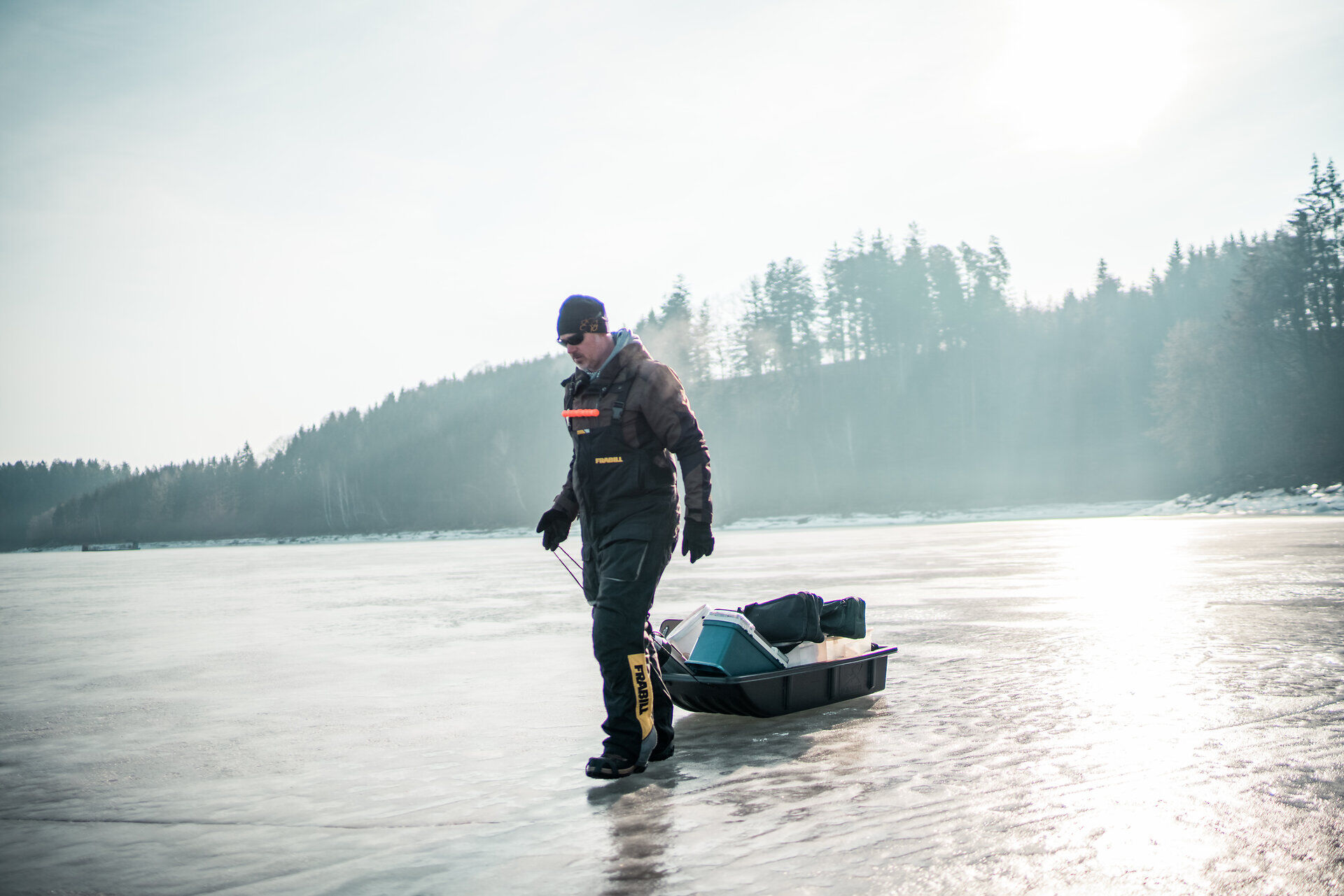 In kalten Wintern, wenn sich eine tragende Eisschicht bildet, hat das Wasser ganz unten immer 4 Grad. Dort sammeln sich dann die Fische und Bernhard Berger geht mit kleinen Gruppen zum Eisfischen. Durch handgebohrte Löcher mit 16-17 cm Durchmesser, mit heißem Tee und oft auch mit gemeinsamem Grillen des frischen Fangs direkt am See.