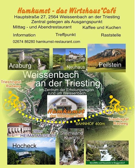 Das Cafe-Restaurant 'Hamkumst' in Weissenbach an der Triesting ist ein Ort, der ein Gefühl von 'DAHAM' vermittelt. Als Nichtraucherlokal bietet es eine Vielzahl von kulinarischen Genüssen an. Das Angebot reicht von Frühstück, Jause/Brotzeit/Snacks, Mittagstisch (a la carte und Tagesteller), Kaffee und Kuchen (hausgemachte Mehlspeisen) bis hin zu Abendessen/Dinner. Die Auswahl an Abendessen umfasst alles von Schnitzel über vegetarische Gerichte bis hin zu Steak oder Burger und ausgewählten klassischen Desserts. Die reichhaltige und farbenfrohe Speisekarte enthält sowohl traditionelle als auch unterhaltsam abwechslungsreiche Gerichte und wird ständig durch wechselnde saisonale Tagesangebote ergänzt. Darüber hinaus bietet das 'Hamkumst' auch Grill-Catering an. Ein Besuch im 'Hamkumst' ist ein kulinarisches Erlebnis, das man nicht verpassen sollte.