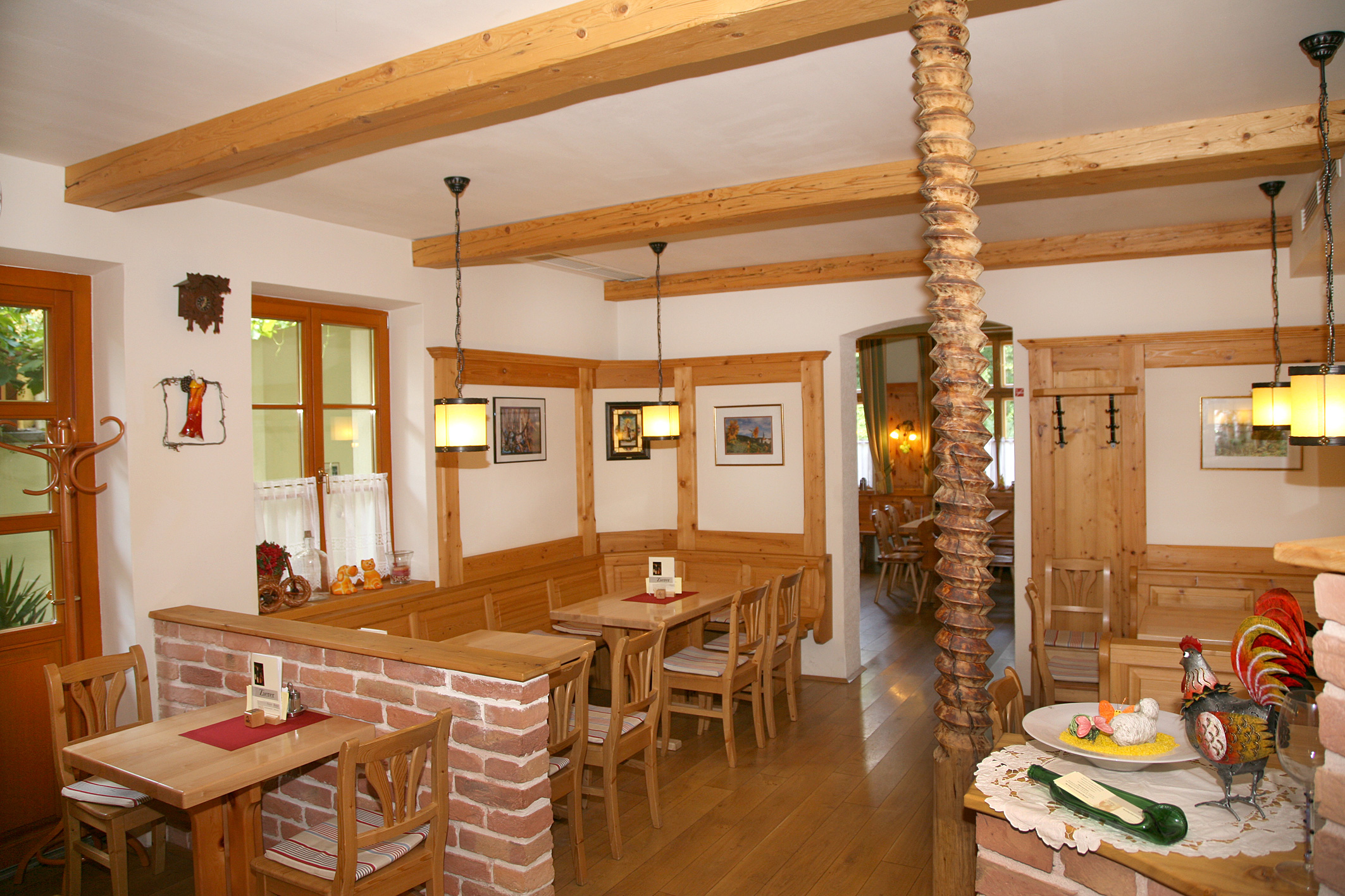 Das helle freundliche Lokal umfasst ca. 55 Sitzplätze, angrenzend befinden sich das Altholzstüberl sowie das Zirbenstüberl, die jeweils wieder Platz für ca. je 30 Gäste bieten. Bei Sonnenschein ladet der große Garten - mit Nußbaum - zum Verweilen ein.