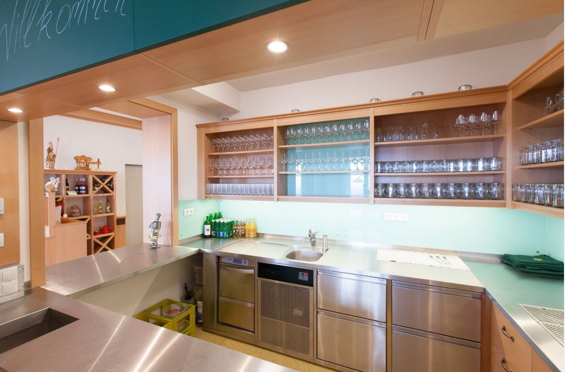 Innenraum Heuriger Holztische mit Sesseln