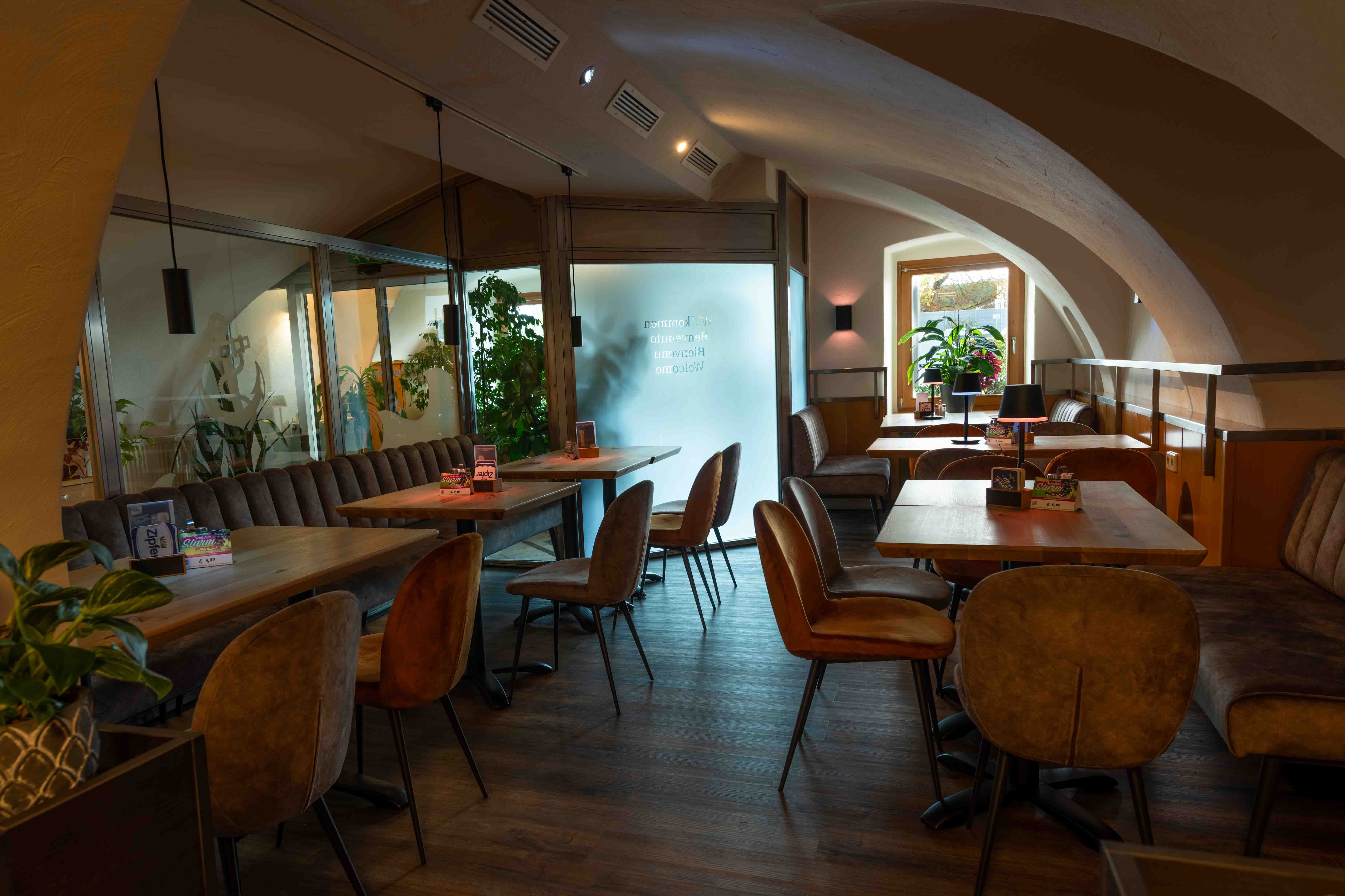 Auch im Café servieren wir Ihnen durchgehend von 11.00 bis 22.00 Uhr leckere Speisen, warme Gerichte und Snacks aus unserer Küche im Hotel Anker.
