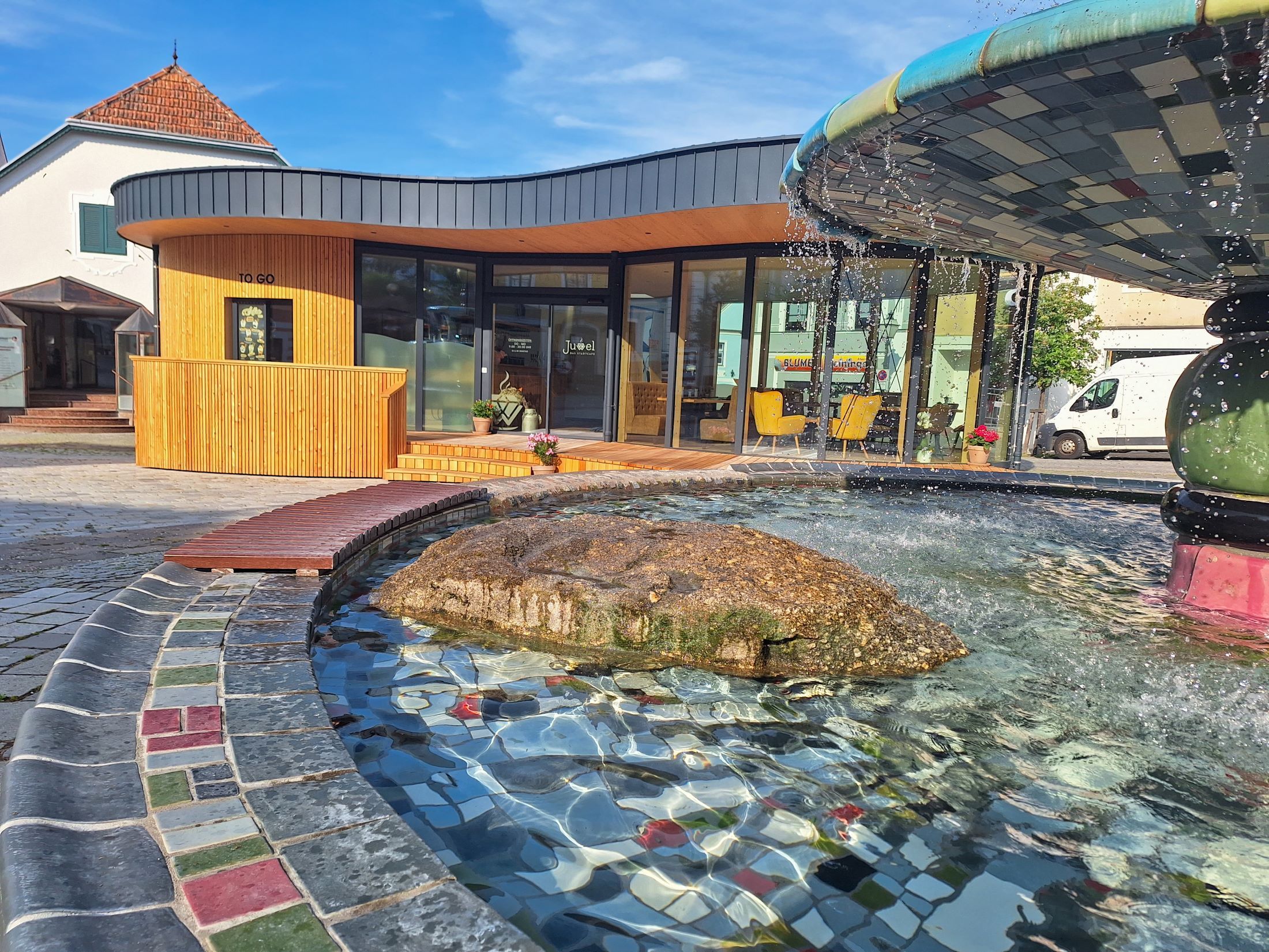 Das Stadtcafé Juwel befindet sich am Hauptplatz in Zwettl und wurde 2023 neu gebaut und eröffnet. Direkt neben dem Hundertwasser-Brunnen erstrahlt es im modernen Design.