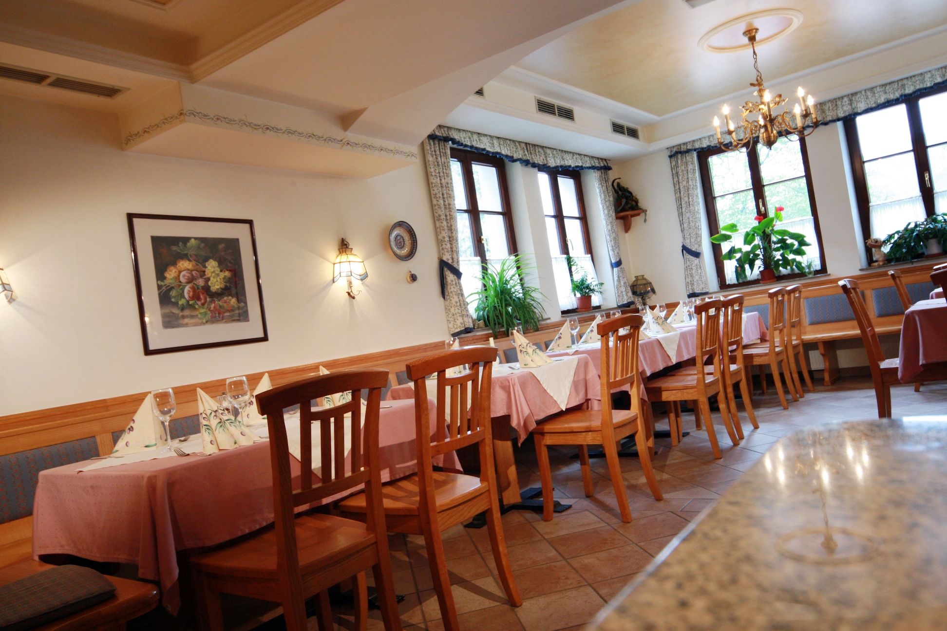 Außenansicht des Landgasthofs Erber mit orangefarbener Fassade und Blumenkästen.