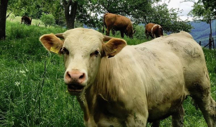 • Das Kalb ernährt sich durch Säugen bei der Mutterkuh, mit Silage und Heu bzw. durch Weiden, mit Getreide aus eigenem Anbau und Rübenschnitten.