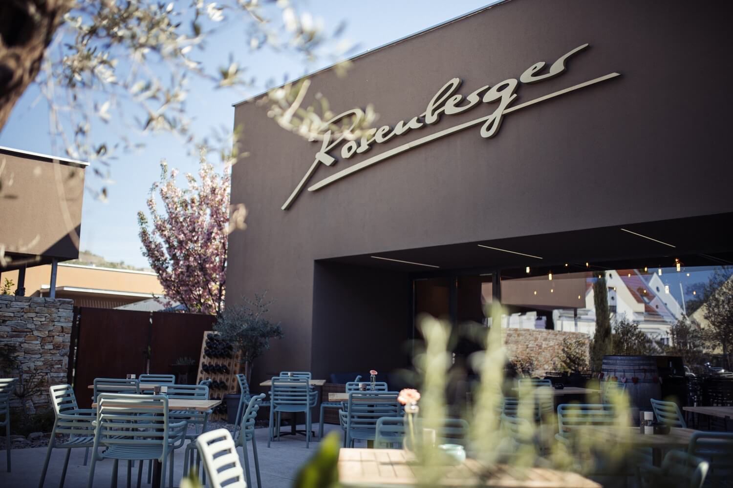 Modernes Gebäude des Weinguts Rosenberger bei Dämmerung mit beleuchtetem Schriftzug.