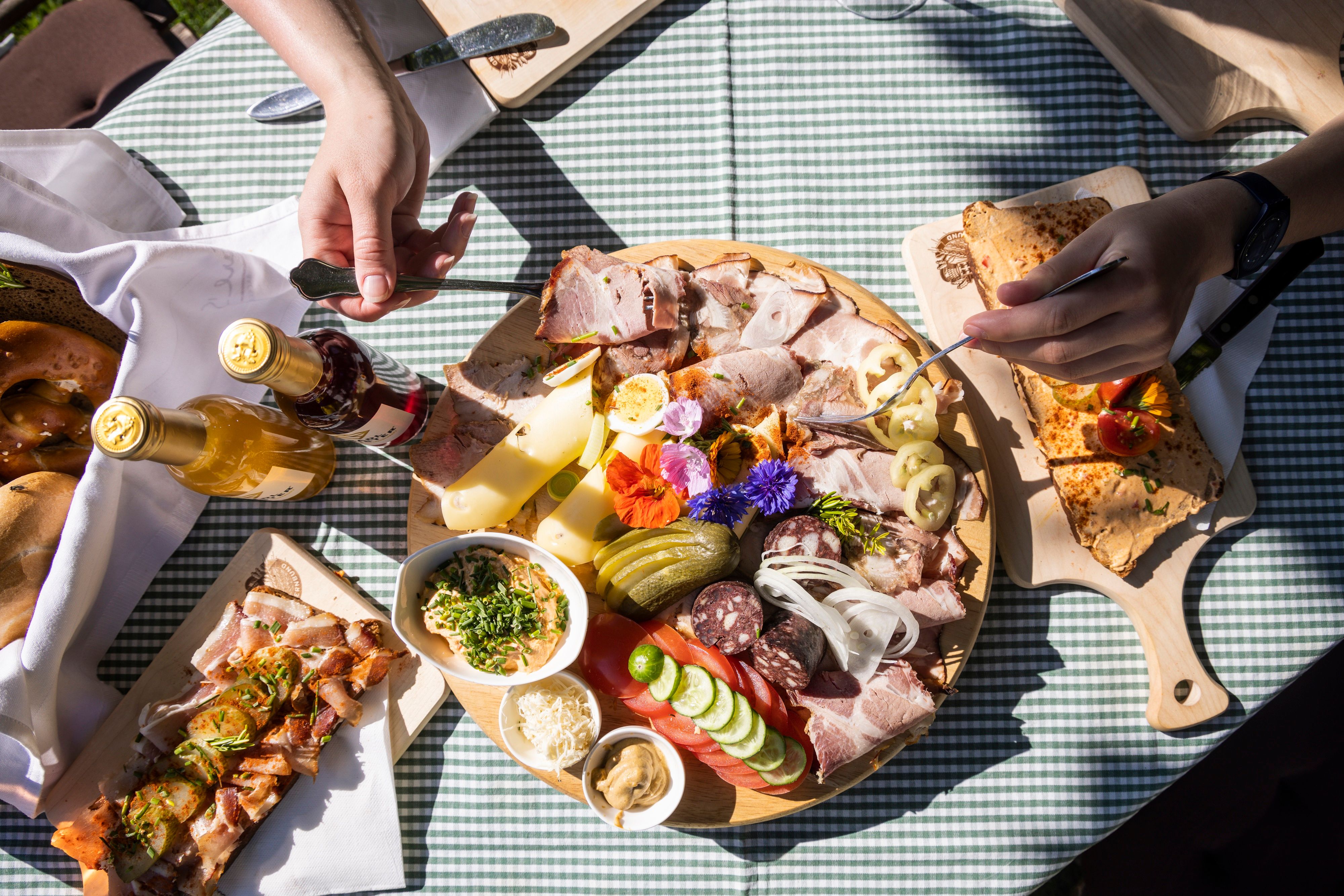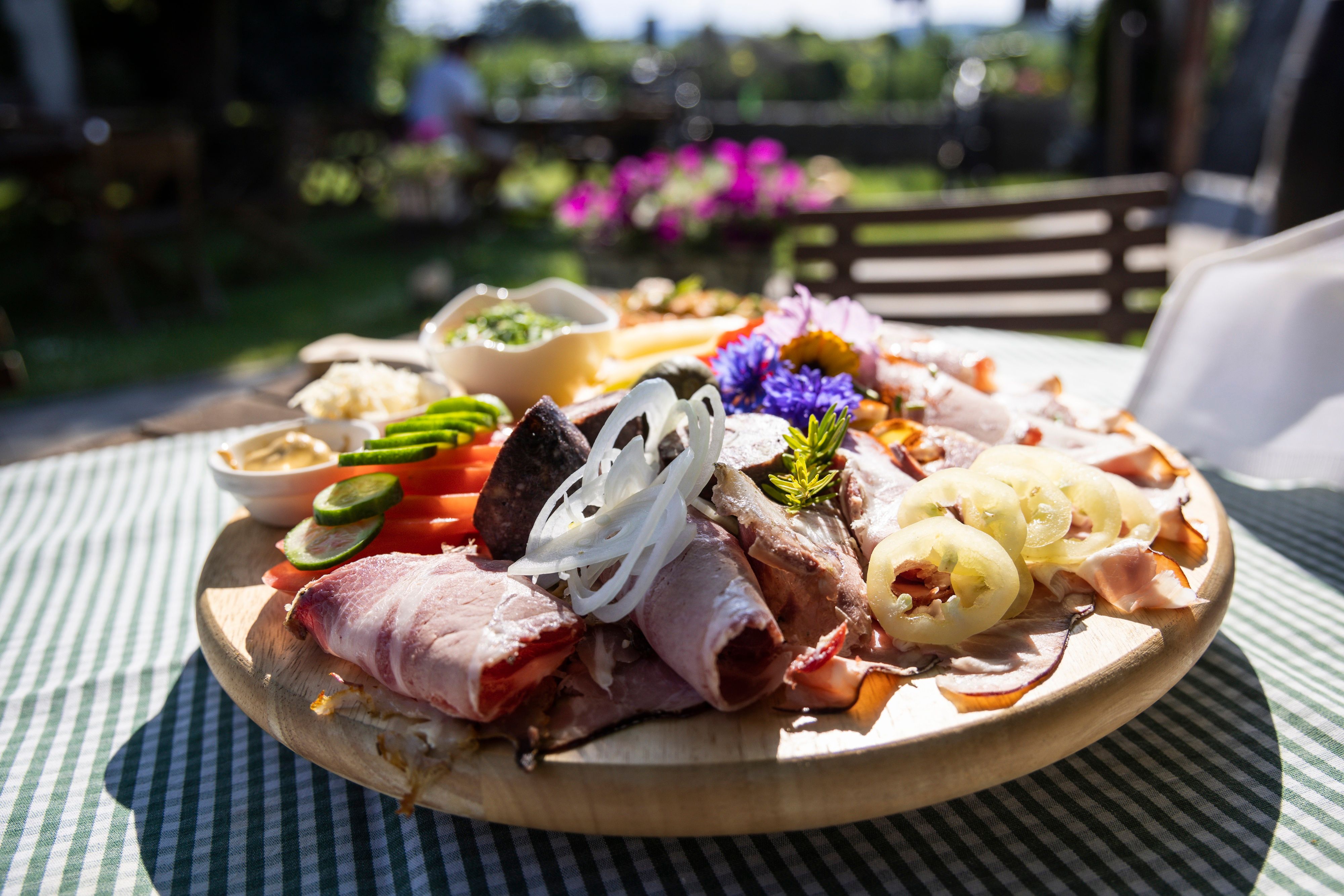 Lassen Sie sich von unseren 100 % eigenproduzierten Qualitätsweinen und herzhaften Radljausen verwöhnen.