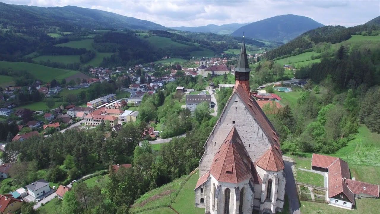 Luftaufnahme der Wolfgangskirche in Kirchberg am Wechsel umgeben von grüner Landschaft.