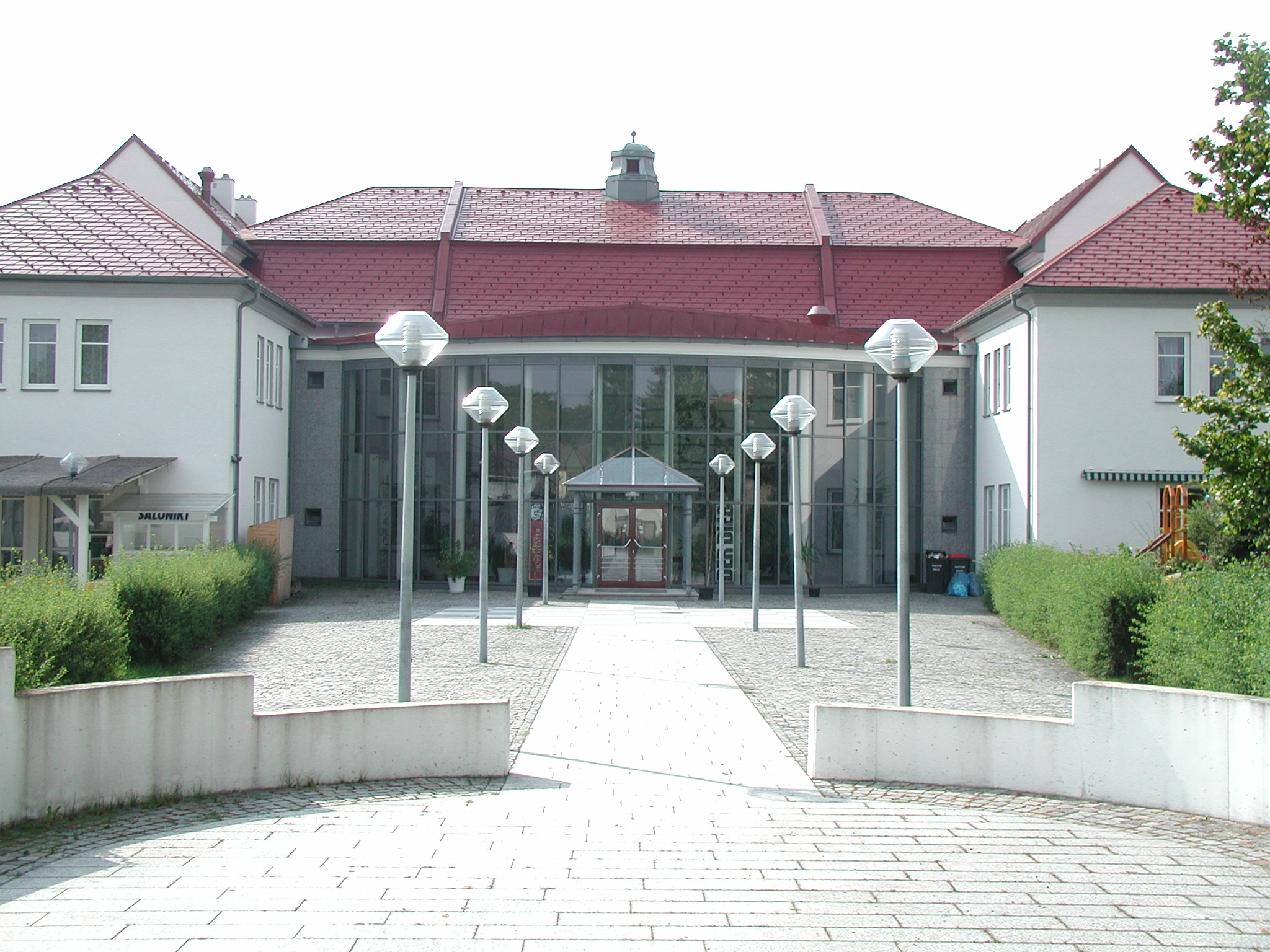 Eingang eines modernen Kulturhauses mit Glasfassade und roten Dächern.