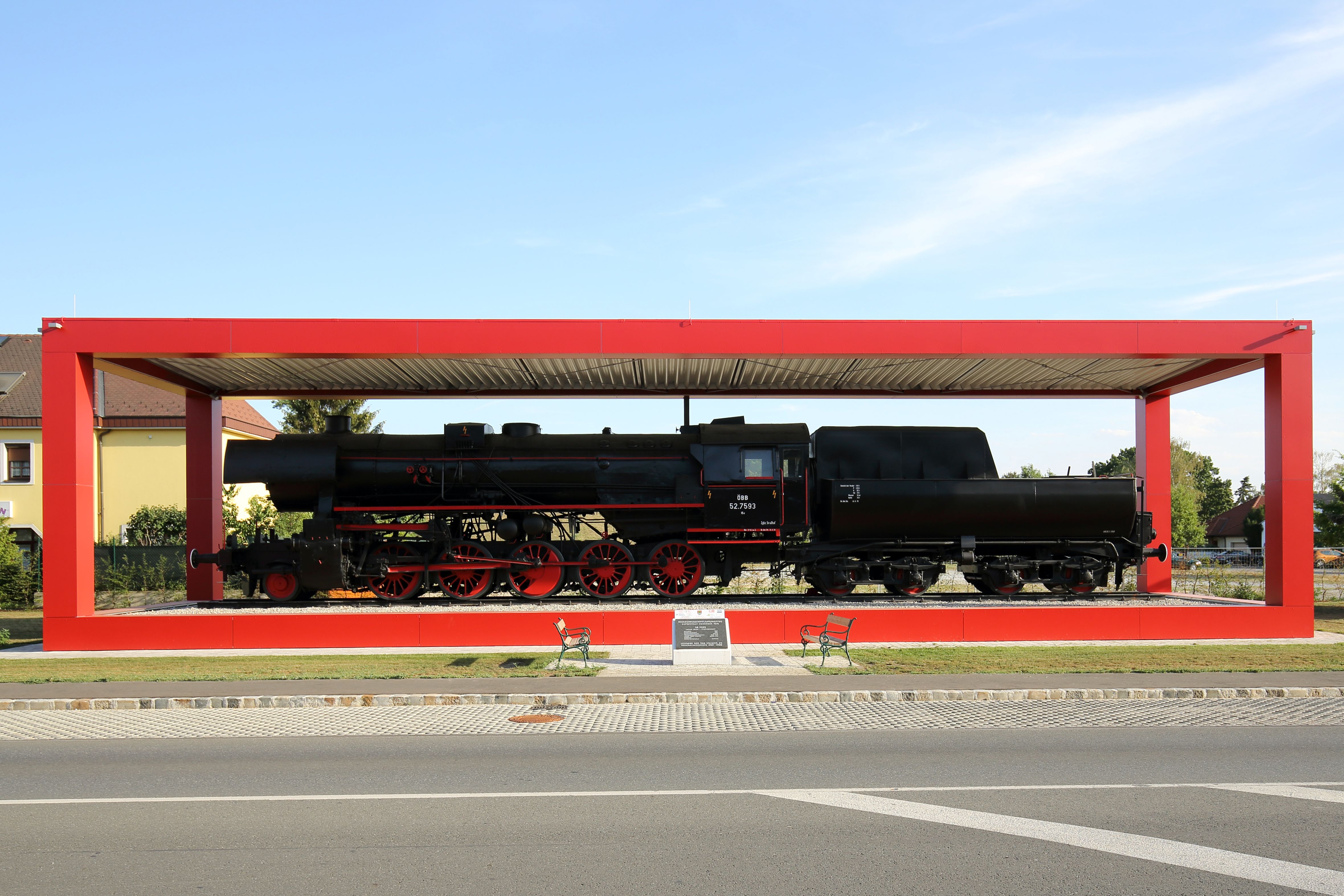 Die Denkmal Lok wurde im November 1978 aufgestellt und von Oktober 2021 bis März 2022 saniert und um eine Überdachung erweitert. Früher wurden Modelle dieser Lok (Kleinbahn) in kleinen Verpackungen verkauft und so ließ sich der Architekt von einer solchen Verpackung zu diesem Dach inspirieren.