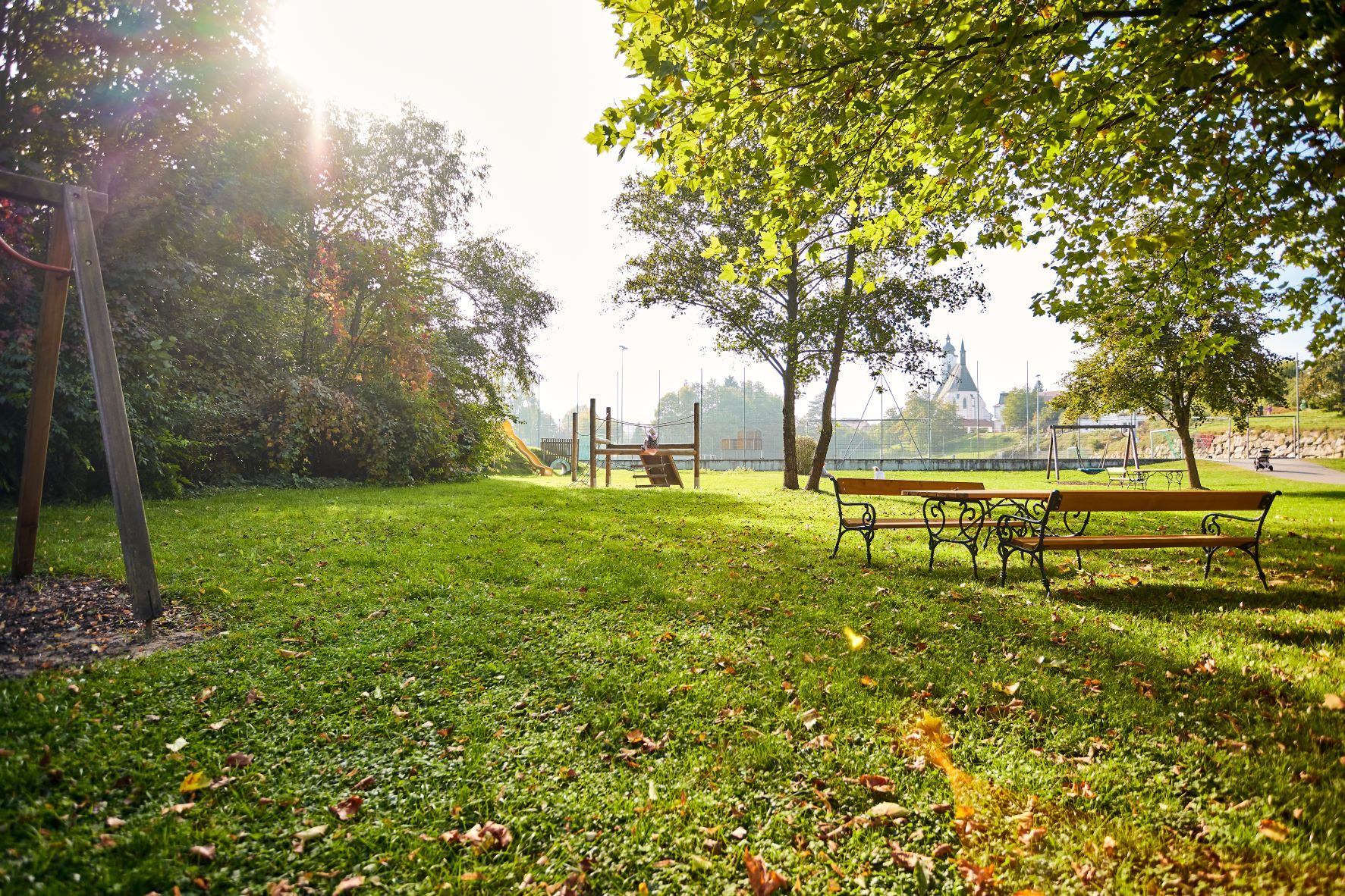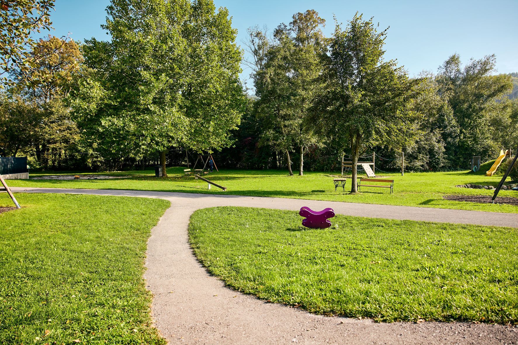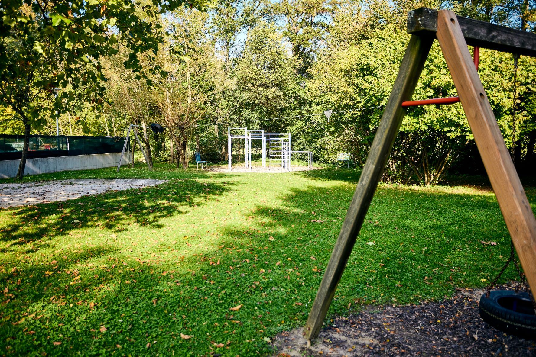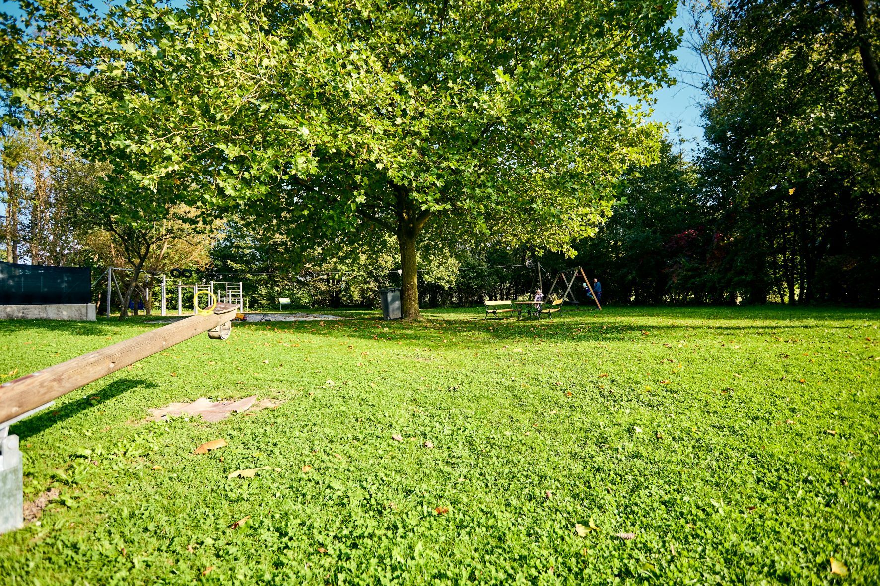 Große Fläche zum Spielen und Laufen, verschiedene Spielgeräte, Tische und Bänke sind verfügbar