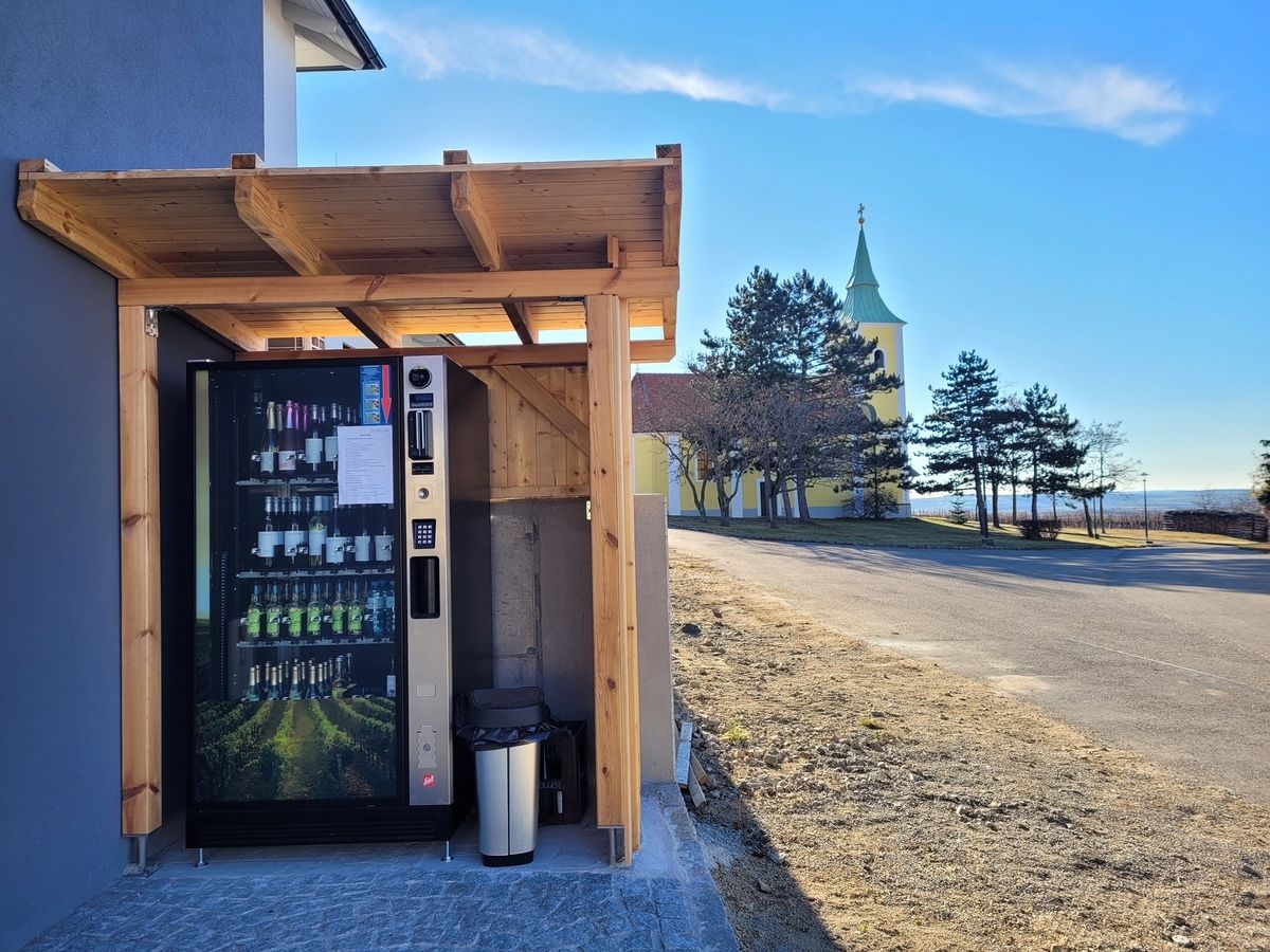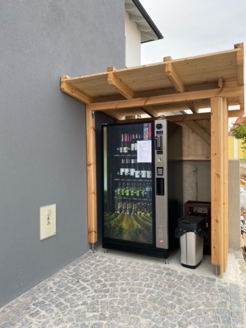 24 Stunden, 7 Tage die Woche sind hier gekühlte Weine und Traubensaft vom Weingut Schüller, sowie Wasser und Kürbiskernöl erhältlich.