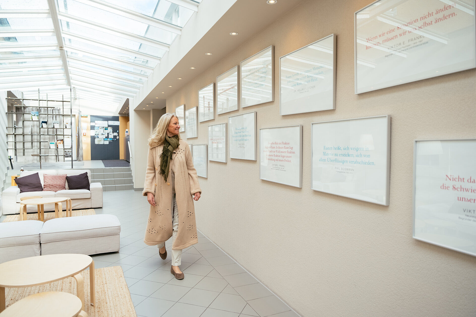 Eine besondere Stätte ist auch der alte Klostergarten, in dem die Kräuter für die hauseigene Klosterküche gezogen werden. Wer hier spazieren geht, dem wird unweigerlich auch der Wiener Neurologe und Psychiater Viktor Frankl “begegnen”: Nach seinem Menschenbild wurden mehrere Installationen am Gelände errichtet, die zum Nachdenken und zur Selbstreflexion anregen sollen. Ein Satz lautet etwa: „Je mehr der Mensch aufgeht in einer Aufgabe, je mehr er hingegeben ist an seinen Partner, umso mehr ist er Mensch, umso mehr wird er er selbst.“ Für Gini, die in ihren Kursen schon vielen Menschen das Handwerkszeug gereicht hat, um sich selbst zu helfen, eine zentrale Erkenntnis: „Jeder Mensch braucht eine sinnstiftende Tätigkeit, mit der er etwas bewirken kann.“ Gini Czernin hat auf alle Fälle als Seminarleiterin ihre glückvolle Wirkungsstätte und Betätigung gefunden.
