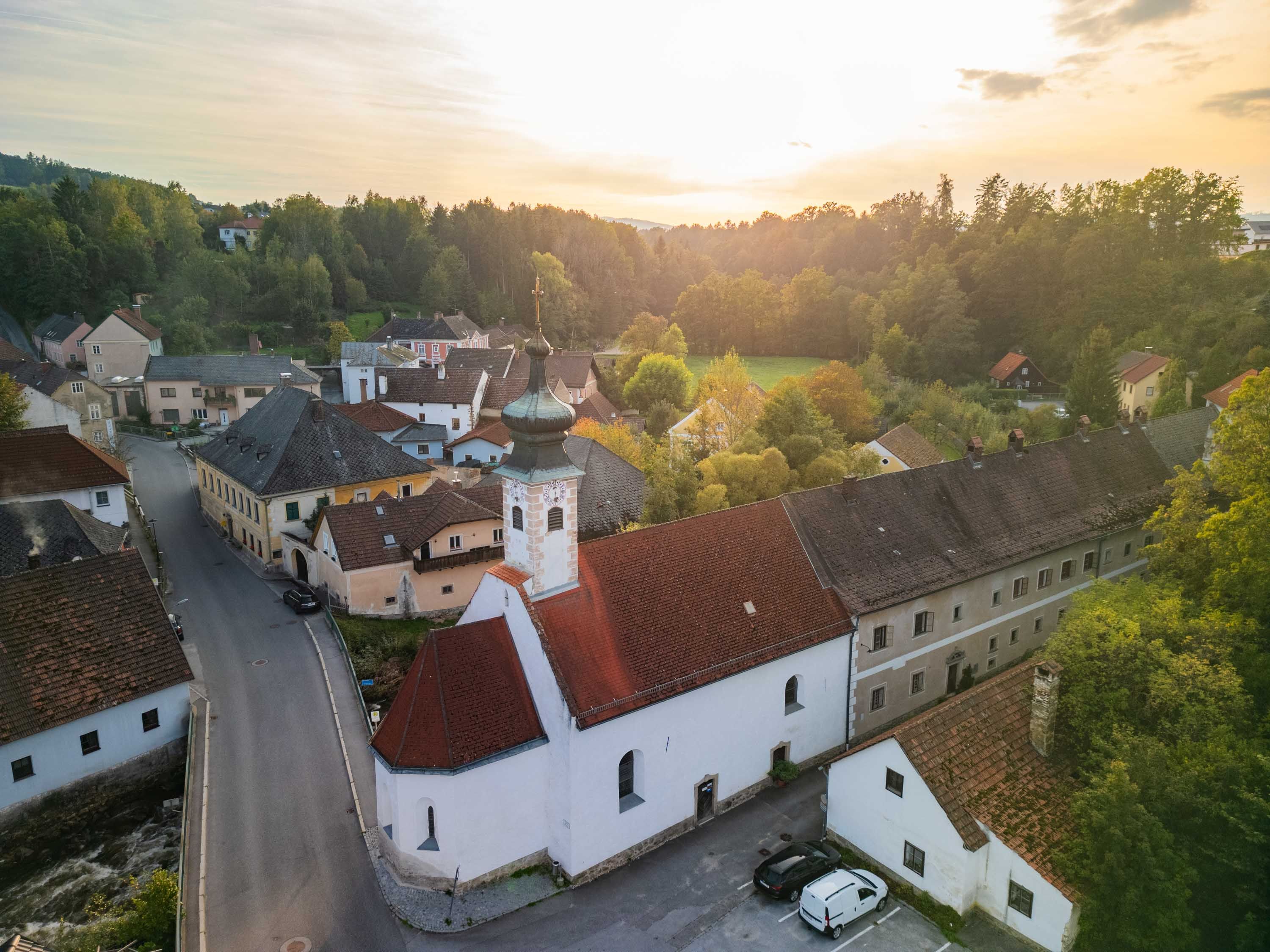 Am Fuße der Stadt Weitra - im sogenannten Ledertal - findet man das Bürgerspital mit seiner Spitalskirche. Friedlich plätschert die Lainsitz an dem angeblich ältesten Steinhauses Weitras vorbei.