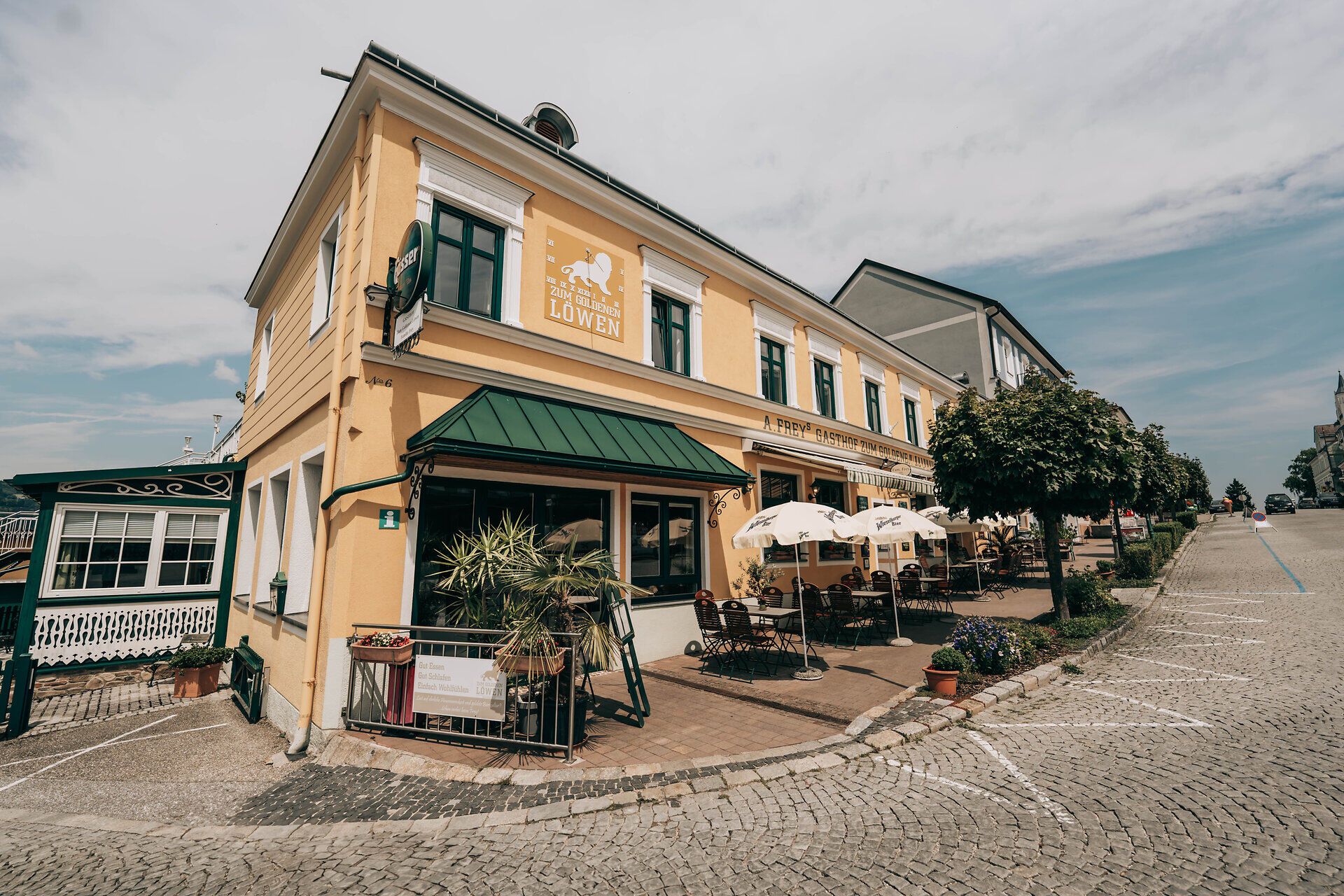Wie oft denkt man sich nach einem gemütlichen Abendessen im Wirtshaus: „Wär das schön, wenn wir jetzt nicht nach Hause fahren müssten.“ Im traditionsreichen Goldenen Löwen kann man zum Glück auch über Nacht bleiben. In den sieben behaglichen Zimmern, sorgsam eingerichtet mit Möbelstücken voller Geschichte, spürt man den Charakter des Hauses – in welches bereits Thronfolger Franz Ferdinand einkehrte. Am nächsten Tag lässt sich die Zeit einfach mit Blick ins Donautal vertrödeln oder der Nibelungengau zu Fuß oder per Rad erkunden. So kann ein Aufenthalt gern auch ein paar Tage länger dauern.