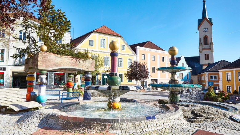Der Hauptplatz der Stadtmauerstadt Zwettl mit dem Hundertwasserbrunnen