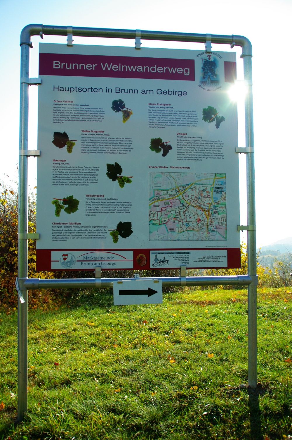 Die Wanderung beginnt am Bahnhof Brunn und führt durch das Ortszentrum, am Gemeindeamt und dem Veranstaltungszentrum BRUNO vorbei in die Adof Hruza-Straße. Von dort geht’s über die Liechtensteinstraße und die Anton Seidl-Gasse zum Sieghartsbergweg, wo der eigentliche Weinwanderweg beginnt. Vorbei an der Hiatahütte und der ersten Schautafel zum Thema „Hauptweinsorten in Brunn am Gebirge“ wandern wir mit perfektem Blick ins Wiener Becken und auf die Burg Liechtenstein, vorbei an den Schautafeln zum Thema „Buschenschank“ und „Boden“ zum Barmhartstalweg.