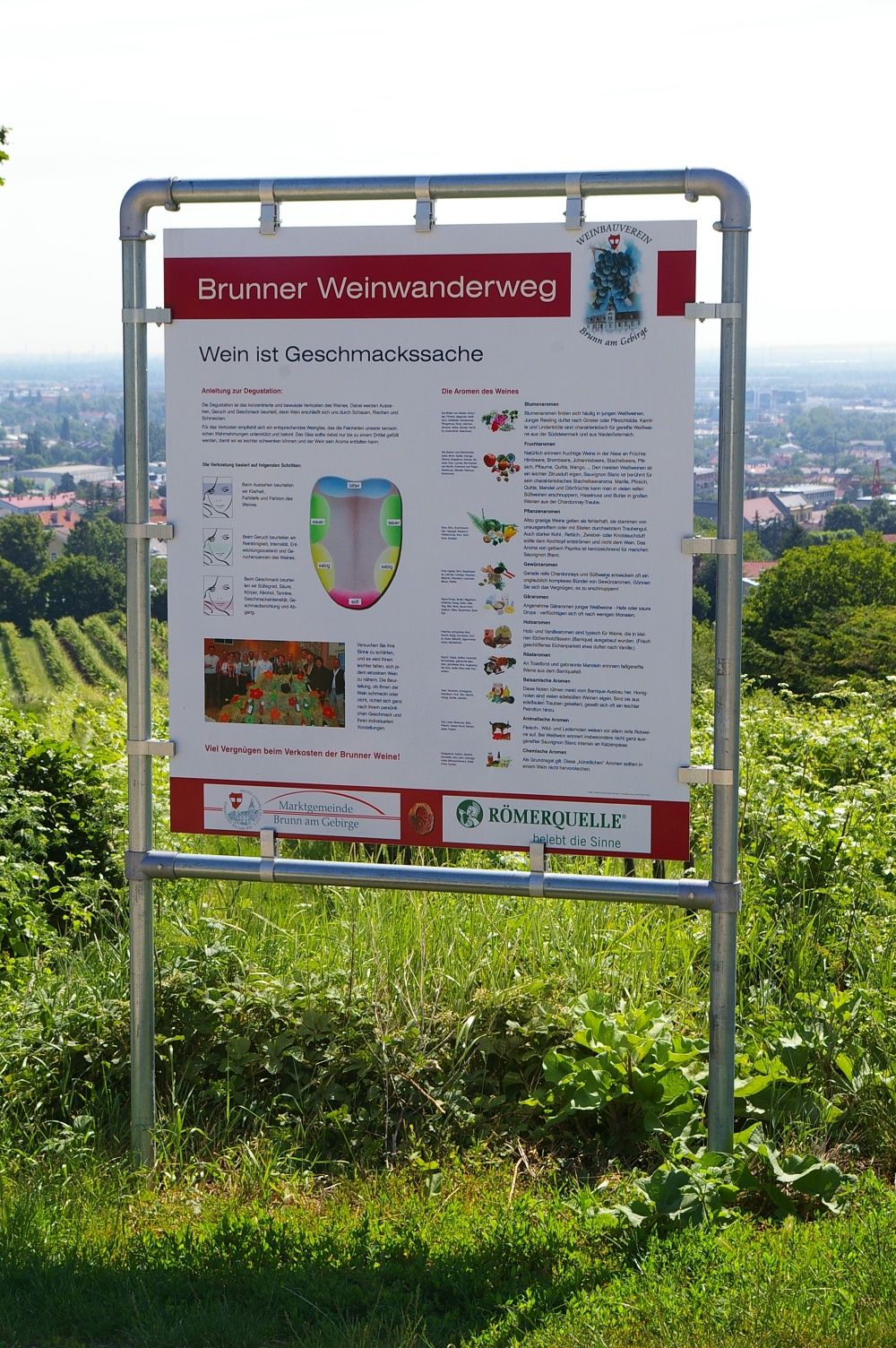 Über die Scheibengasse geht es weiter zur Mozartgasse und zur Schautafel „Weinerzeugnisse“. Ab jetzt geht es bergab. Wir passieren das Hauerplatzl das zum Verweilen einlädt, und kommen zur Hiatahütte am Kaiserried mit perfektem Wien Blick. Über die Alois Ramminger-Straße geht’s zur letzten Schautafel zum Thema „Biologischer Weinbau“ hinunter zur Leopold Gattringer-Strasse. Von dort haben wir uns entschieden, nicht der Hauptstraße entlang, sondern über die Viktor Adler-Straße und den Tierarzt-Ludwig-Müllner-Weg zur Pfarrkirche zu gehen, bevor wir auch schon wieder am Bahnhof Brunn eintreffen.