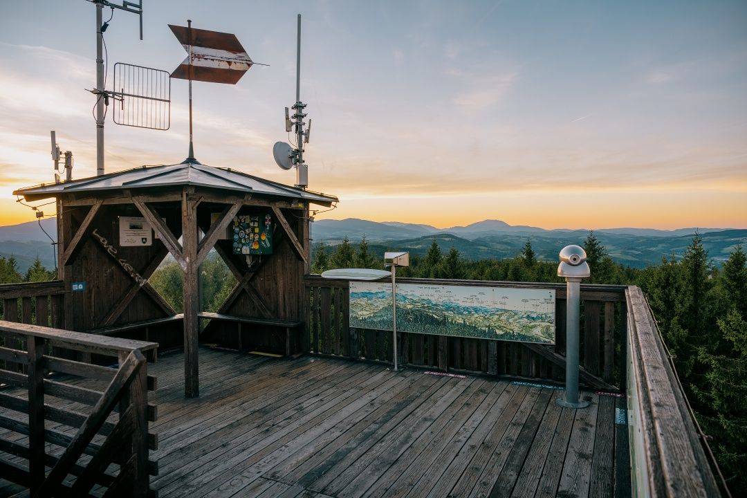 Oben angekommen wartet ein toller Rastplatz und die Aussichtsplattform. Belohnt wird man mit einem grandiosen 360° Ausblick auf Schneeberg, Rax und Wechsel bzw. in die andere Richtung bis zum Neusiedler See, nach Ungarn und über das Südburgenland hinaus.