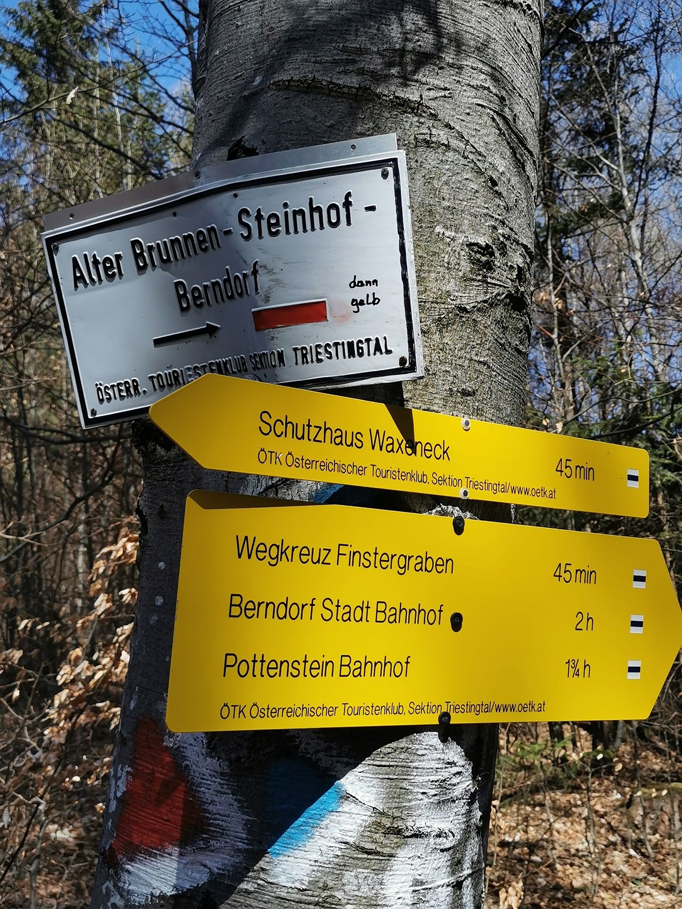 Bei dieser gemütlichen, aber doch relativ langen Wanderung startet man im Ortsgebiet von Berndorf, beim Bahnhof, wodurch auch eine öffentliche Anreise möglich ist. Anfangs führt die Wanderung durch das Ortsgebiet und die Kruppsiedlungen bergauf zur Margarethenkirche und den Schulgebäuden, um dann durch Neubaugebiete den Wasserturm zu erreichen (bis hierher auch mit Auto möglich). Hier verlässt man das Stadtgebiet und wandert auf meist guten Wegen, oft durch Schwarzföhrenwälder und Buchenwälder und mit einer gleichmäßigen Steigung über 8 km bis zum höchsten Punkt der Wanderung (768 m). Von hier gelangt man wenige Meter bergab zum Waxeneckschutzhaus (das vom Hals her auch mit dem Auto erreichbar ist), von dessen Terrasse man während der Einkehr eine schöne Aussicht über die Gutensteiner Alpen bis hin zum Schneeberg genießen kann. Für die kleinen Wanderer ist ein Kinderspielplatz vorhanden. Obwohl Kombinationsmöglichkeiten, z.B. über den Heuschober und Geyergraben vorhanden sind, wird klassischer Weise wieder auf der Anstiegsroute zurück nach Berndorf gewandert, wo man dann noch abschließend den Sehenswürdigkeiten der Stadt (Margarethenkirche, Stilklassen, Kruppmuseum) einen Besuch abstatten kann.